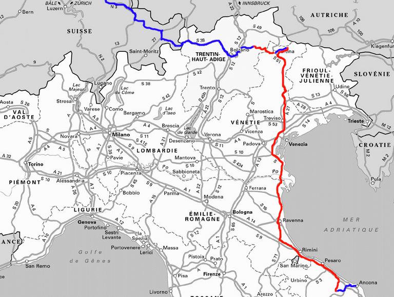 Nous sommes entrés dans la Province autonome de Bolzano, encore appelée Sud-Tyrol ou Haut-Adige. Cette région très disputée est redevenue italienne à la fin de la Première Guerre mondiale. La majorité des habitants sont germanophones, l'italien et le ladin, proche du romanche, sont les autres langues officiellement parlées. C'est la région la plus riche d'Italie.
