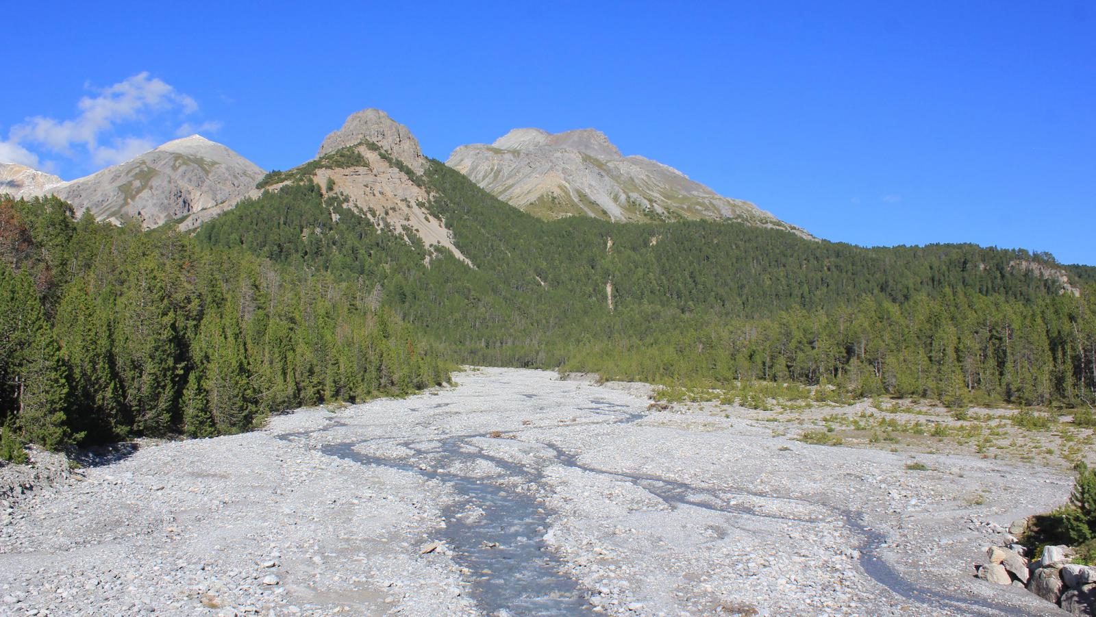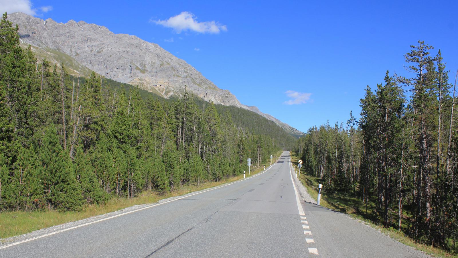 Nous passons le col de l'Ofen à 2 149m, ou Pass Dal Fuorn en romanche, et entamons la descente vers Müstair. Ici, toutes les indications sont écrites dans les quatre langues officielles du pays, à savoir français, allemand, italien et romanche. Nous sommes dans une des vallées des Grisons où cette dernière est la plus pratiquée. Cette vallée a été classifiée réserve biosphère par l'Unesco pour sa grande diversité de patimoine naturel et culturel. Les paysages sont magnifiques, faits de prairies verdoyantes, de forêts d'aroles surmontées de pics spectaculaires. ils évoquent pour nous l'ouest Canadien et les parcs de Banff et Jasper... Isa me rappelle l'originalité de ces pins typiques de la haute montagne que nous avons déjà rencontrés en Suisse au pied du Cervin et au Canada : la reproduction des arolles est assurée en partie par un oiseau, le casse-noix moucheté, qui enfouit les graines puis oublie une grande partie de ses réserves permettant ainsi la pousse de nouveaux arbres.