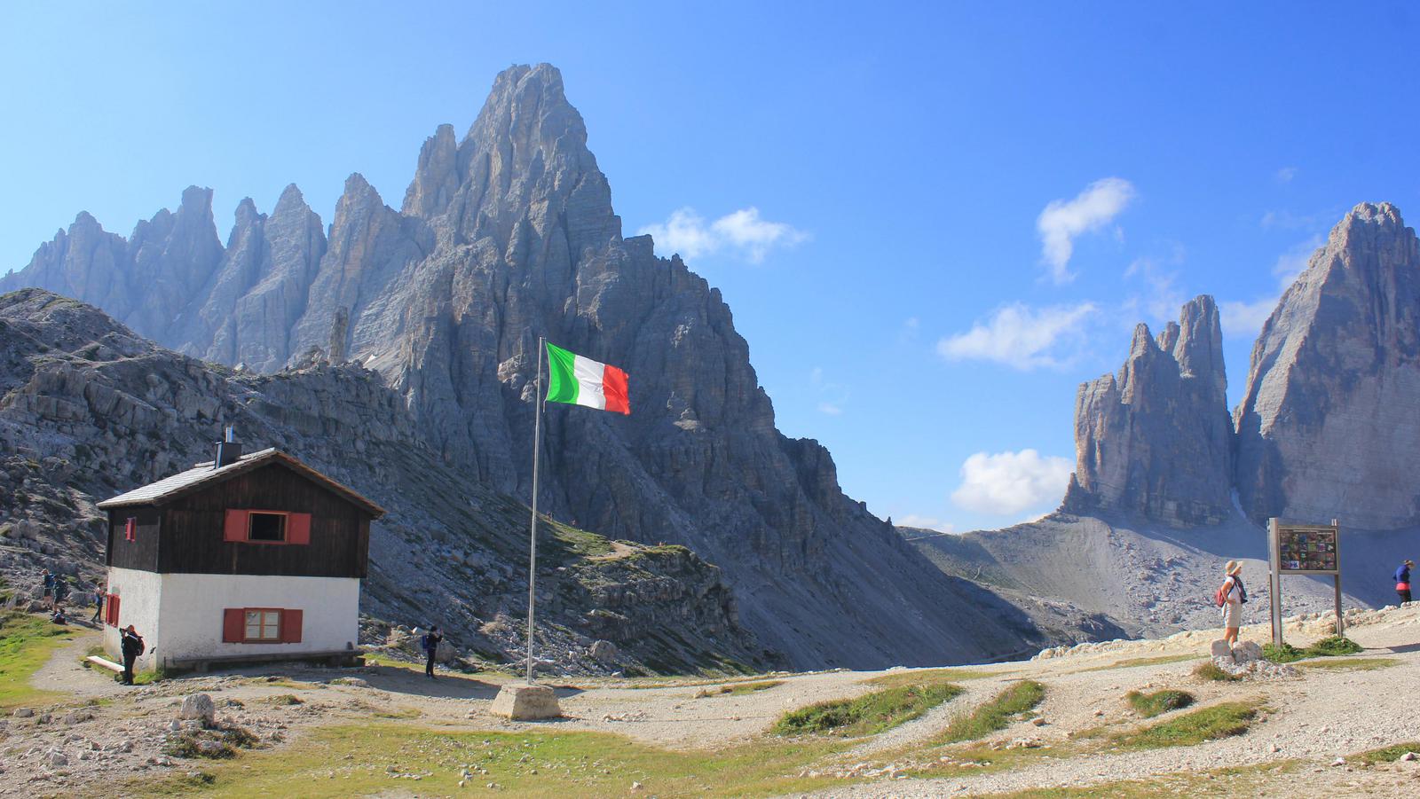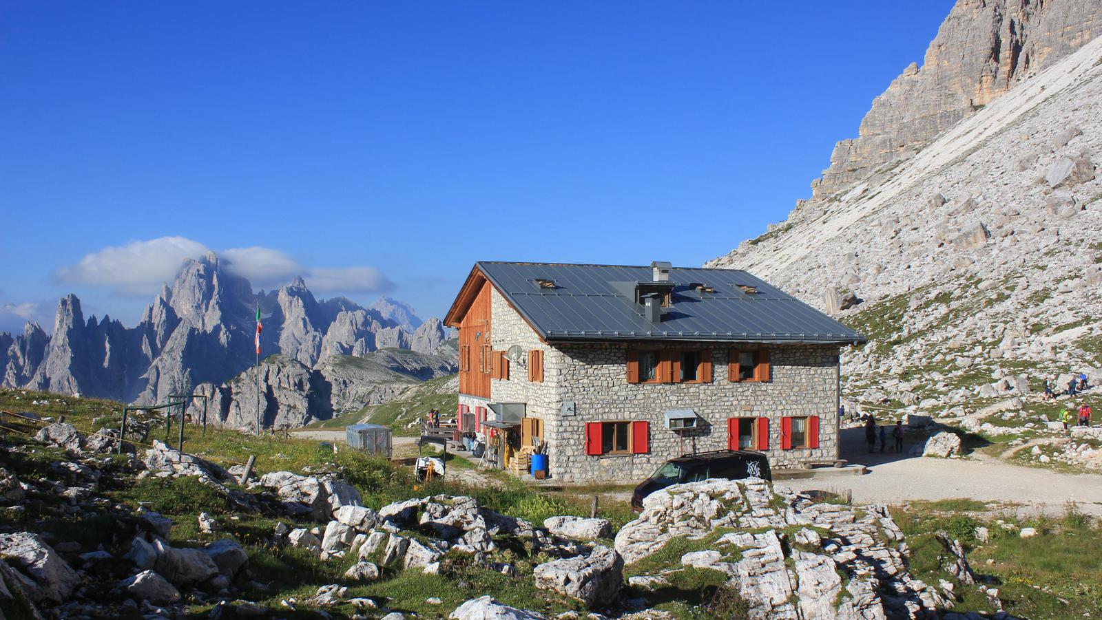 Nous arrivons au refuge au prix d'un dernier effort pour gravir les hautes marches d'une succession d'escaliers aménagés dans la roche. Nous avons quitté la province de Belluno et sommes revenus dans celle de Bolzano/Bozen. Les inscriptions sur le refuge sont en allemand, le "refugio alle Tre Cime" est maintenant le "Drei Zinnen Hütte"...