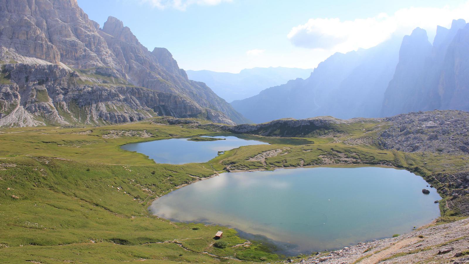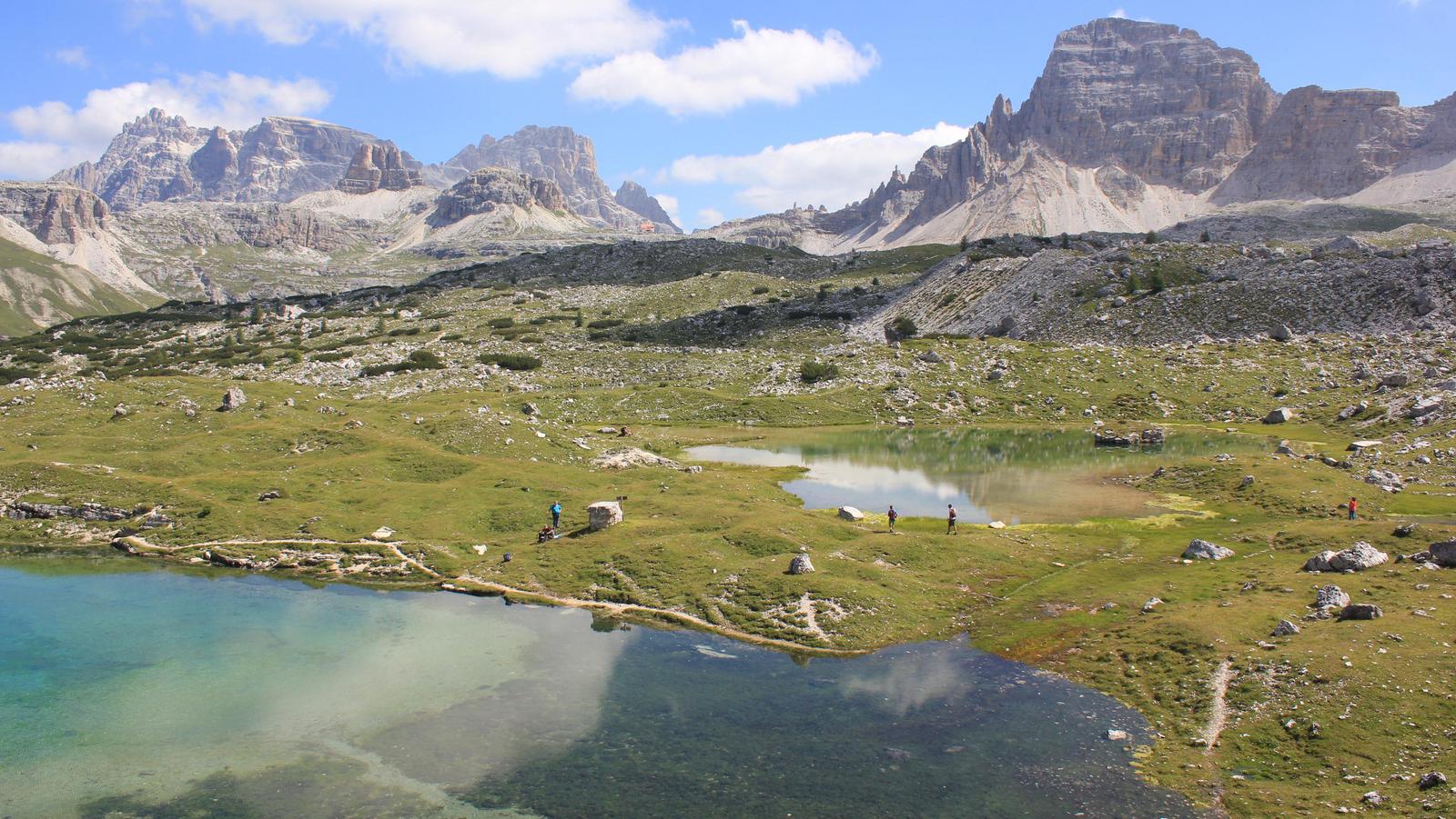 Nous entamons le retour après une pause casse-croûte face aux pics et une large séquence photo de ce magnifique décor. Cette fois nous abandonnons le sentier 101 pour le 105 par le col Forcellina. La descente est abrupte et la remontée tout autant, mais nous sommes récompensés en découvrant les jolis lacs de la Grava Longa. Le soleil est déjà haut, nous n'aurons pas la chance d'admirer le reflet des sommets dans les lacs...