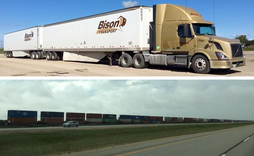 Ce que nous croisons le plus, ce sont des Bisons. Pas encore l'animal, mais les trains routiers composés d'un tracteur et de deux remorques formant un ensemble de 25 m très impressionnant, surtout lorsqu'il nous double avec l'élan d'une descente...