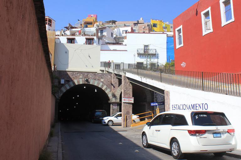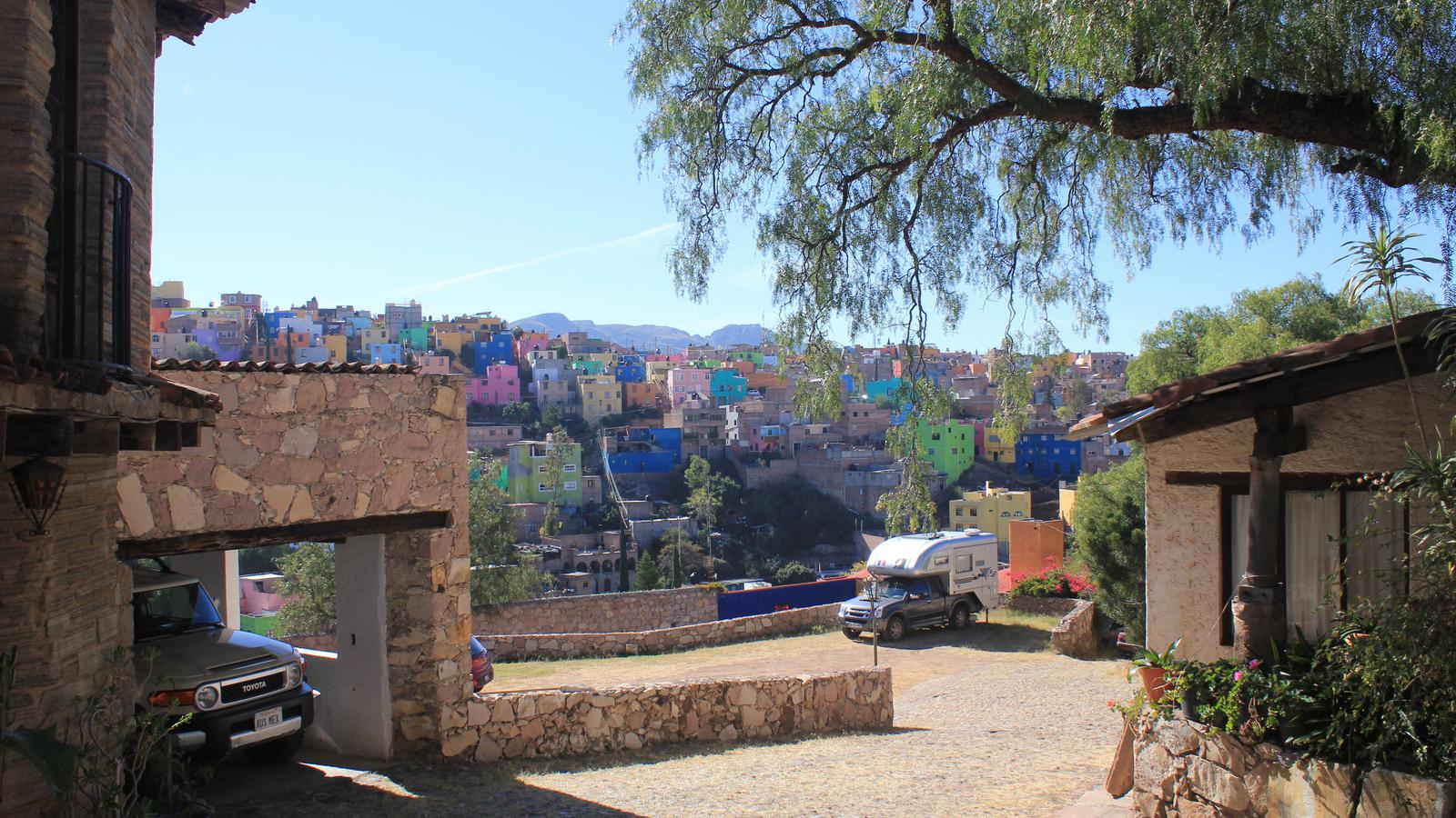 Nous avons prévu de nous installer au Morill RV park. Ce camping est situé au nord de la ville et nous arrivons par le sud. Nous savons que se fier au GPS peut être risqué car cette ville est traversée par plusieurs tunnels et qu'elle comporte un grand nombre de ruelles très étroites dans lesquelles il est impensable de s'aventurer en camping-car. Du reste, des personnes attendent les touristes à l'entrée de Guanajuato et proposent des cartes gratuites de ces tunnels et un accompagnement éventuel moyenant quelques pesos.