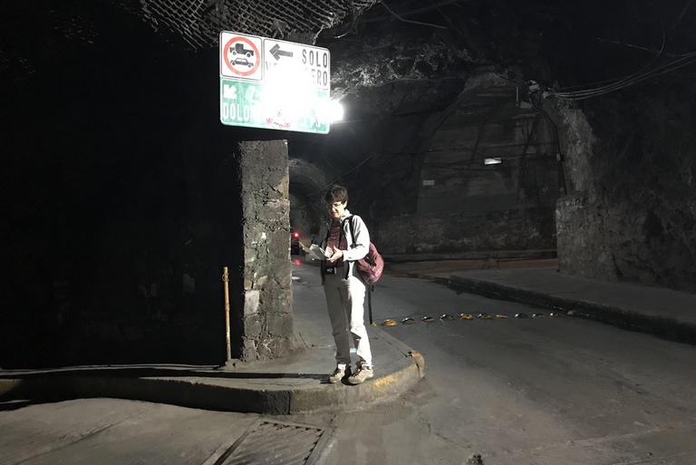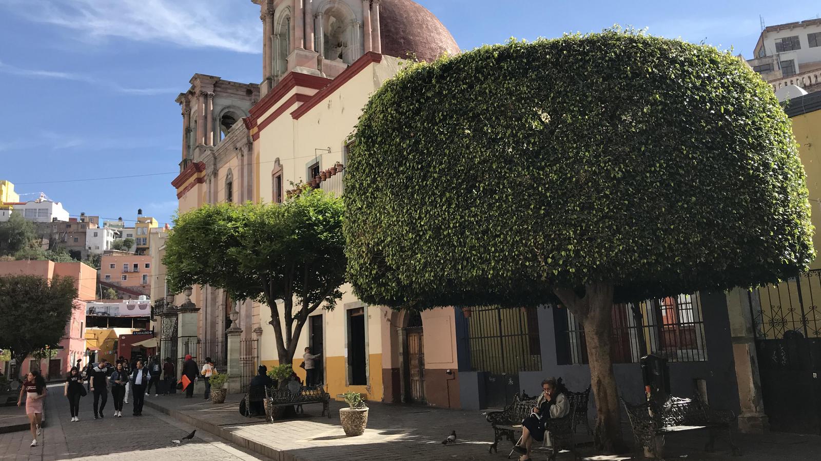 Une fois en bas de la côte, nous comprenons que le centre historique se situe sur l'autre versant de la colline qui est devant nous. Après quelques hésitations, nous décidons de passer par le tunnel, comme de nombreux piétons. Nous arrivons près de la Plaza de la Paz, devant la Basilica de Nuestra Señora de Guanajuato.