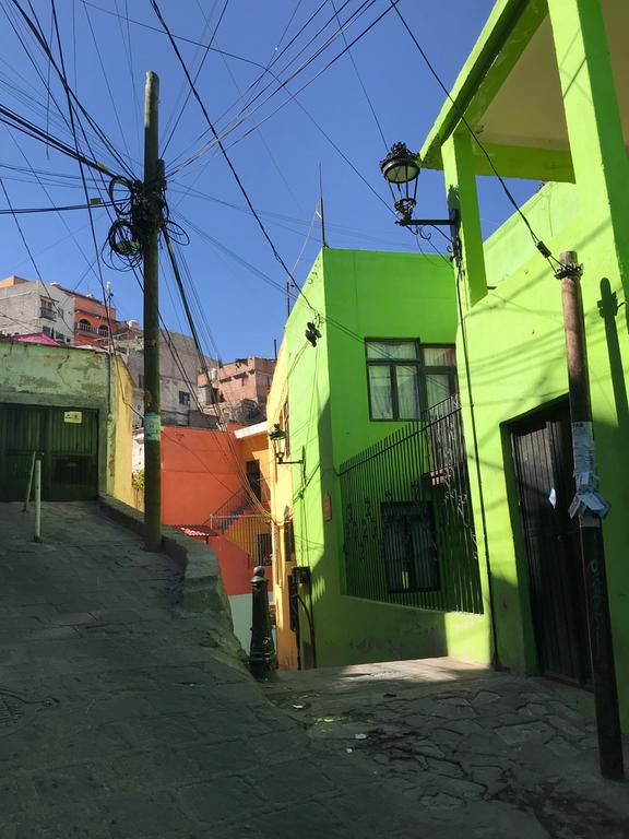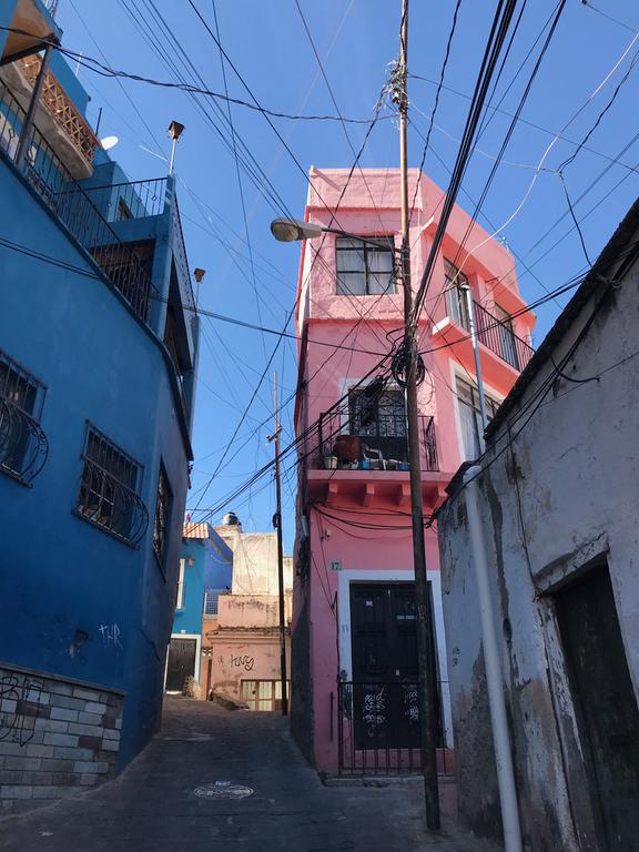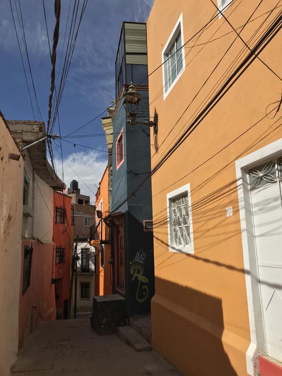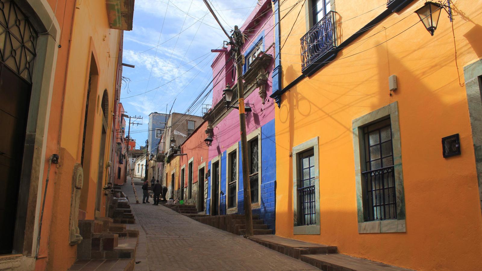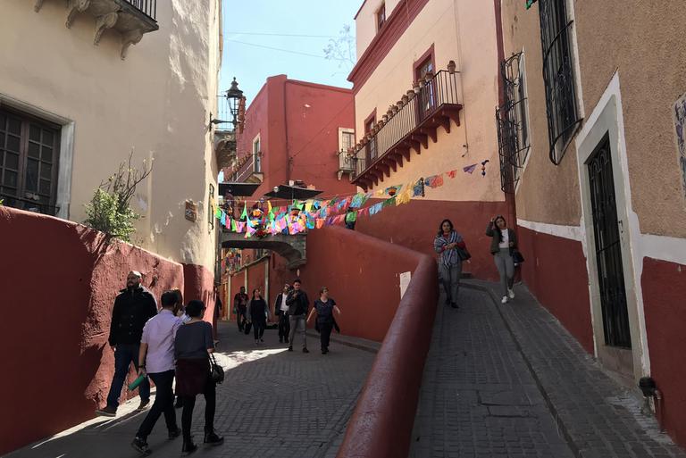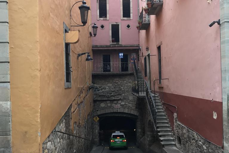 Nous partons à la découverte de Guanajuato. Nous descendons à pied la rue par laquelle nous sommes arrivés la veille, et contrairement à ce que j'imaginais, celle-ci n'est pas en sens unique et les petits camions et les mini-bus l'empruntent. C'est encore pire que ce que je pensais, j'ai eu beaucoup de chance de ne croiser personne...
