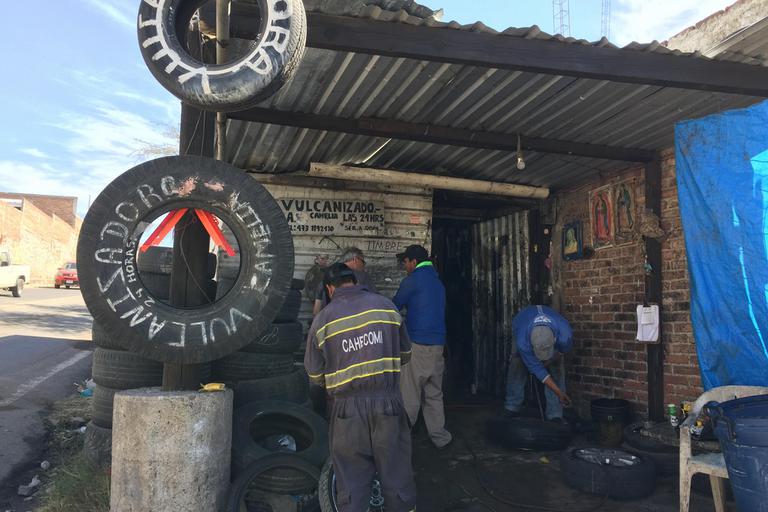 Avant de continuer vers San Miguel de Allende, je dois faire réparer mon pneu. La morphologie de la ville ne favorise pas l'installation de garage, et nous devons parcourir plus de dix kilomètres pour en trouver un. Il faut préciser qu'ici, chaque réparateur a sa spécialité, et celui qui s'occupe des freins ne répare pas les crevaisons...
