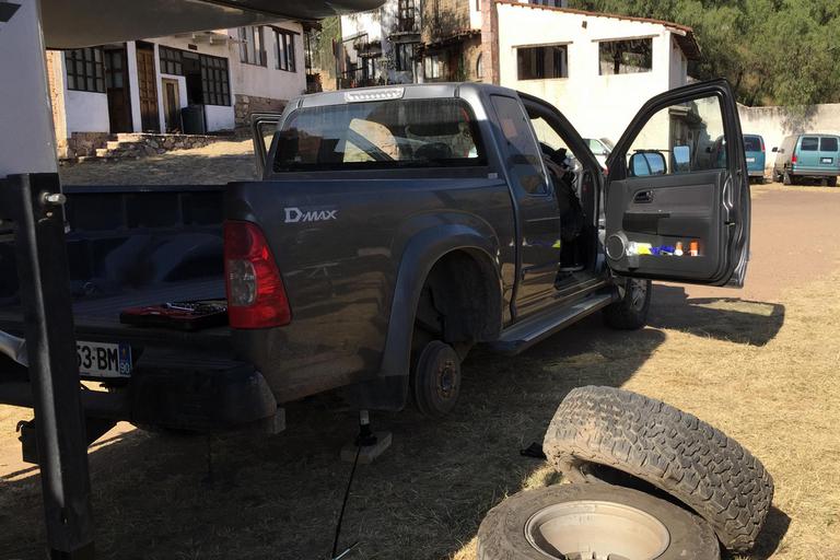 Je dépose la cellule et change la roue, puis repartons en pick-up à la recherche d'une jante acier.
