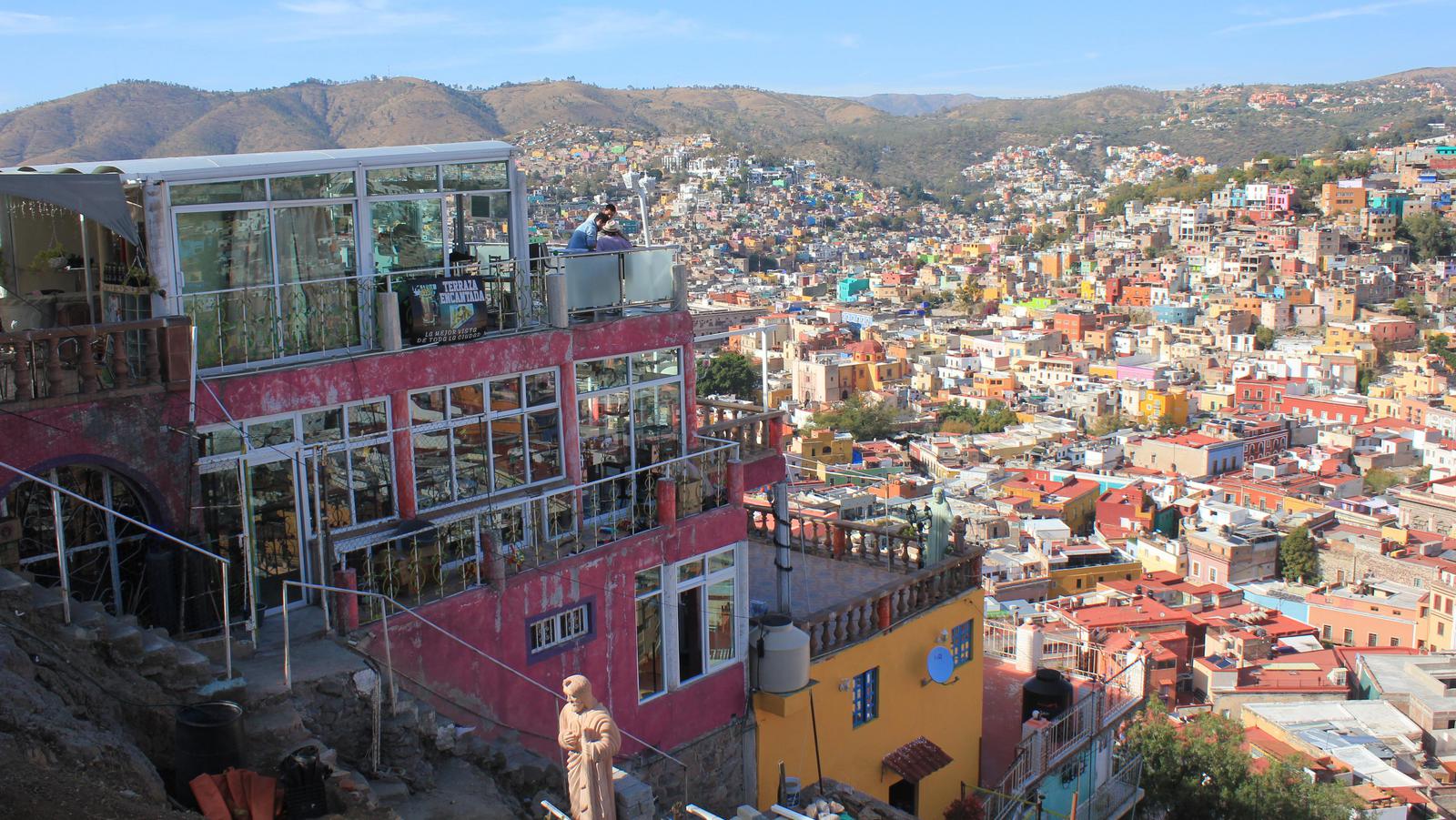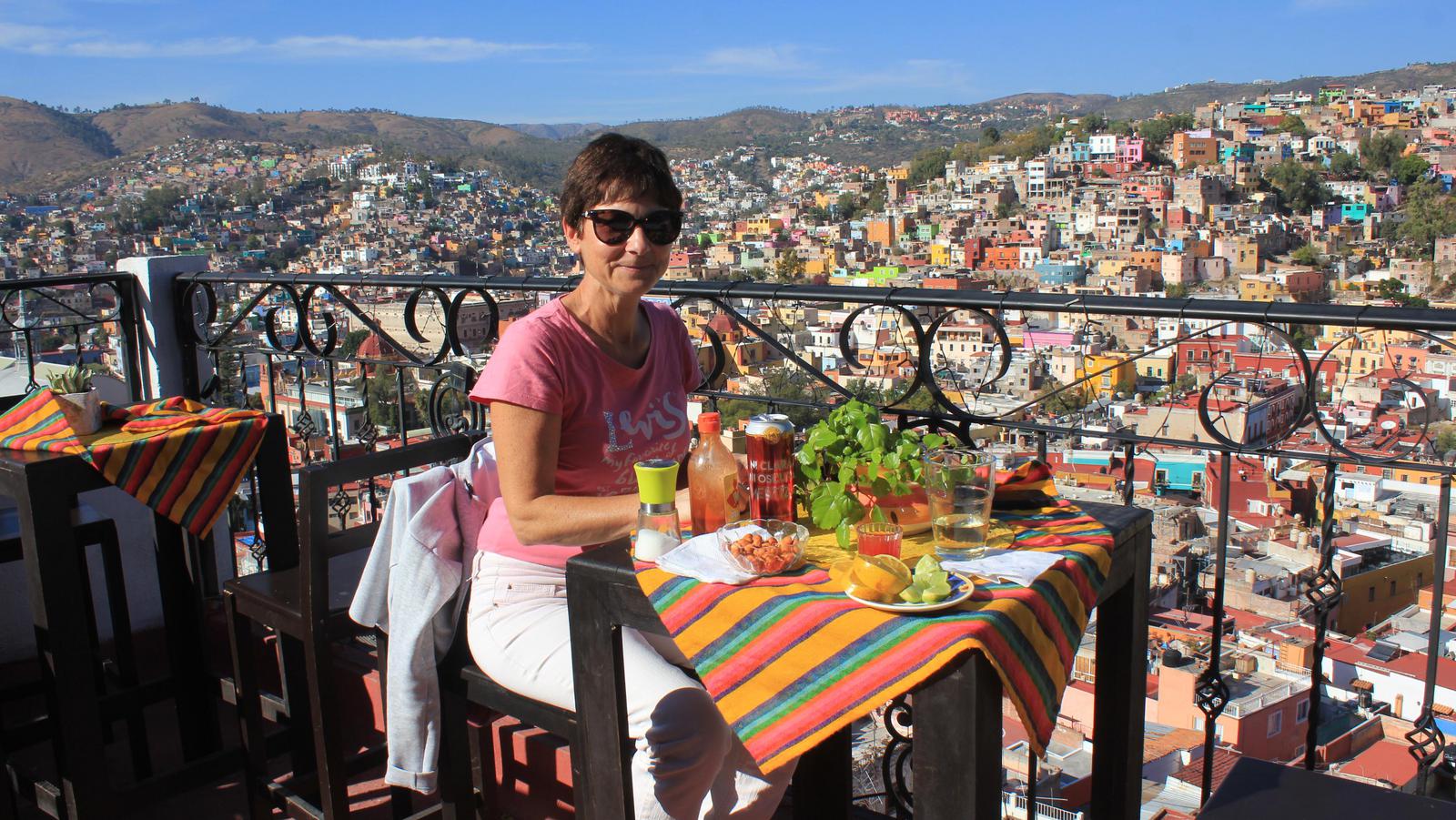 Nous quittons ce point de vue et rejoignons une terrasse de café un peu en contrebas. Celle-ci est tenue par deux dames âgées. Nous sommes les seuls clients installés tout au bout de la terrasse, en balcon au dessus de Guanajuato. Leur accueil est charmant, Isa prend une bière et je commande un tequila. La dame n'en finit plus de nous apporter des accompagnements, en plus de la téquila, j'ai un verre de sangrita (mélange de jus de tomate et d'orange), du sel, du tabasco et une quantité inouïe de citrons verts coupés... Vient le moment de régler l'addition, la dame vient avec la note, 77 pesos, soit à peine 4€ pour nos deux consommations. Nous laissons 100 pesos, elle est ravie, comme nous aimons cette ville !