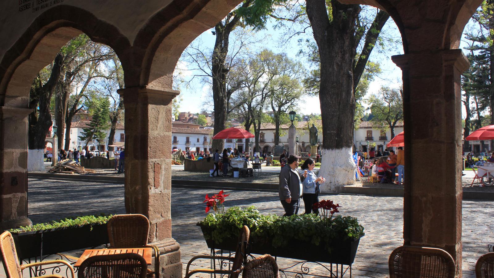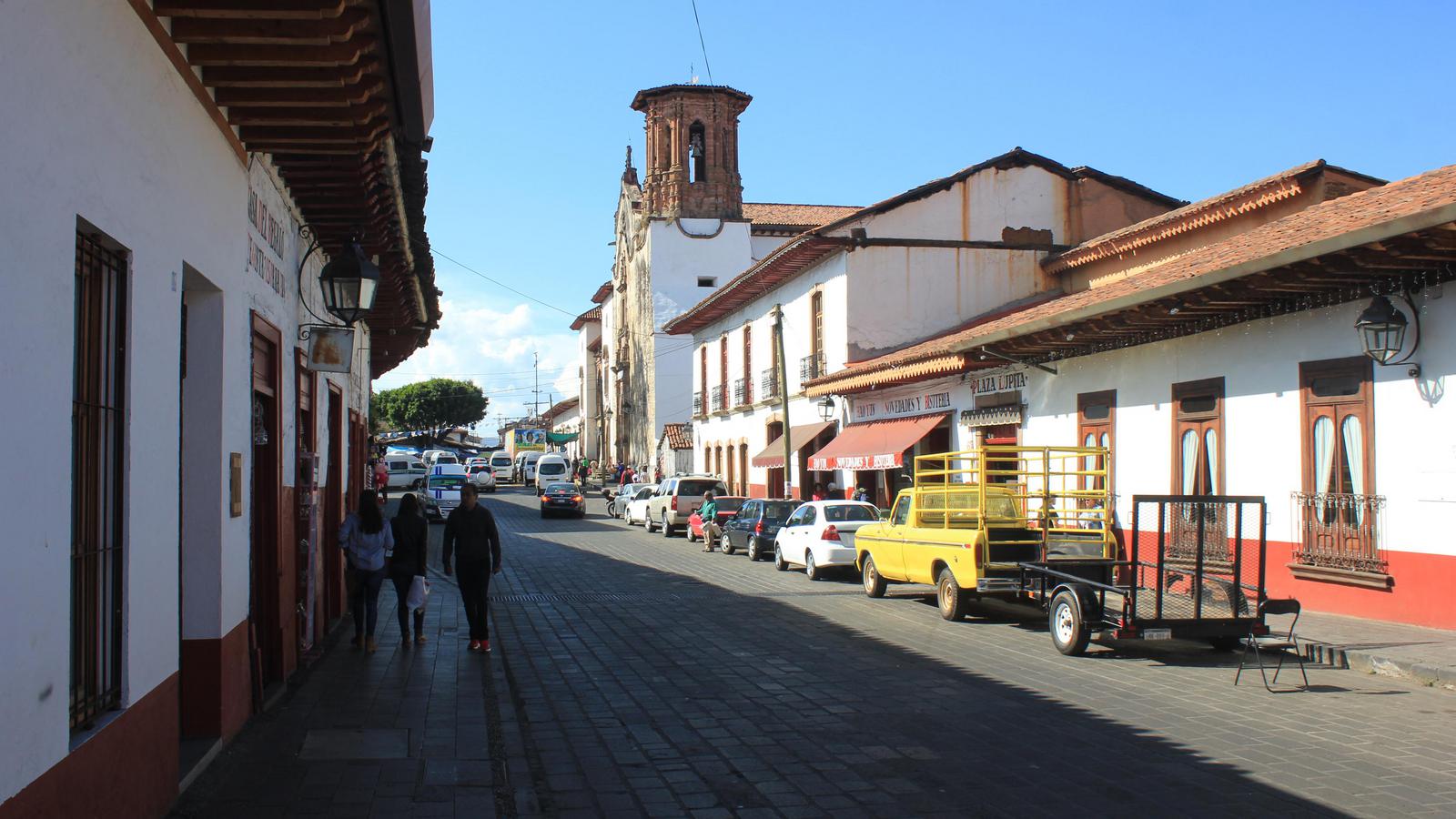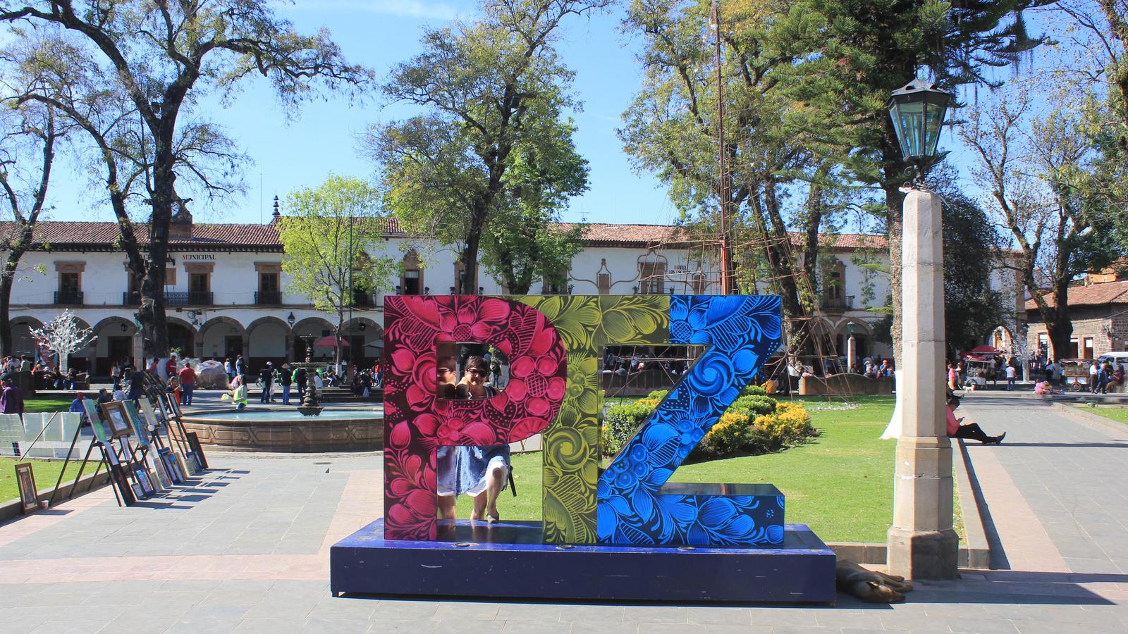 Patzcuaro compte 92 000 habitants. La ville a gardé de son passé colonial ses rues pavées de dalles de roches volcaniques noires, ses toits de tuiles rouges, ses maisons blanches et ses menuiseries rouges, qui la font ressembler aux villages du pays basque. Cette tradition est bien gardée et toutes les enseignes, sans aucune exception, sont peintes sur les façades avec la même calligraphie. L'immense Plaza Vasco de Quiroga bordée de belles maisons coloniales à arcades est très animée en ce dimanche après-midi et très agréable.