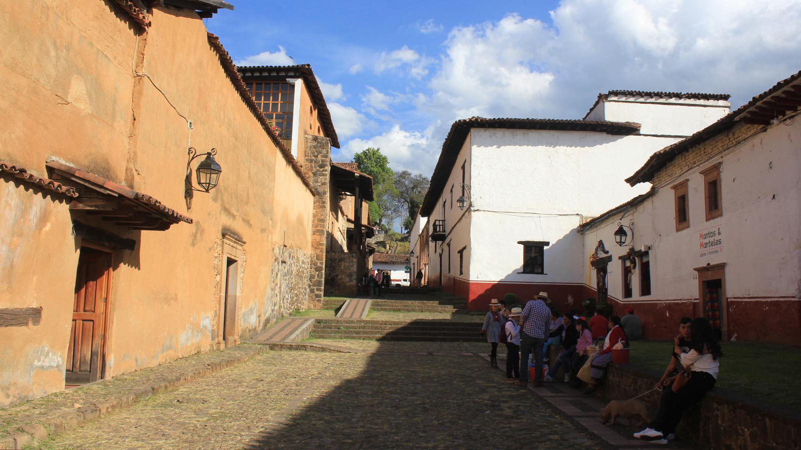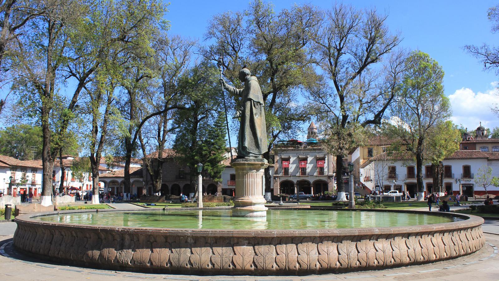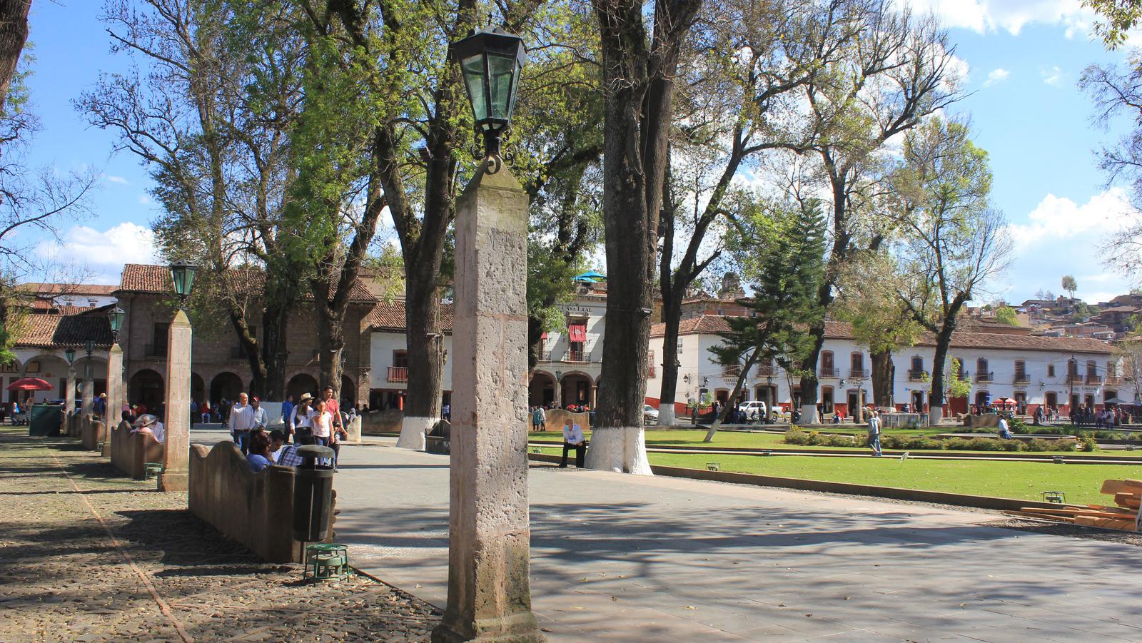 Patzcuaro compte 92 000 habitants. La ville a gardé de son passé colonial ses rues pavées de dalles de roches volcaniques noires, ses toits de tuiles rouges, ses maisons blanches et ses menuiseries rouges, qui la font ressembler aux villages du pays basque. Cette tradition est bien gardée et toutes les enseignes, sans aucune exception, sont peintes sur les façades avec la même calligraphie. L'immense Plaza Vasco de Quiroga bordée de belles maisons coloniales à arcades est très animée en ce dimanche après-midi et très agréable.