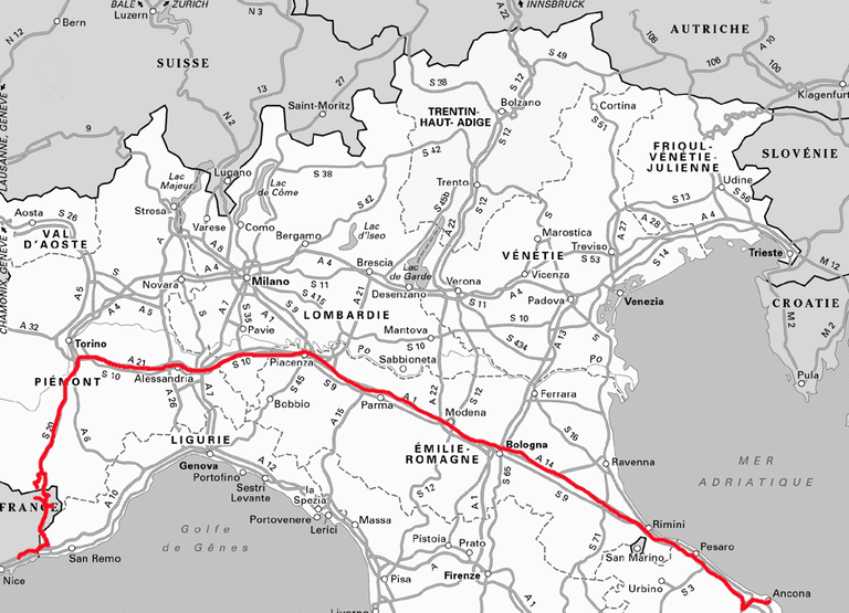 Nous suivons la direction Turin, puis bifurquons à Asti pour entrer en France via le tunnel de Tende.