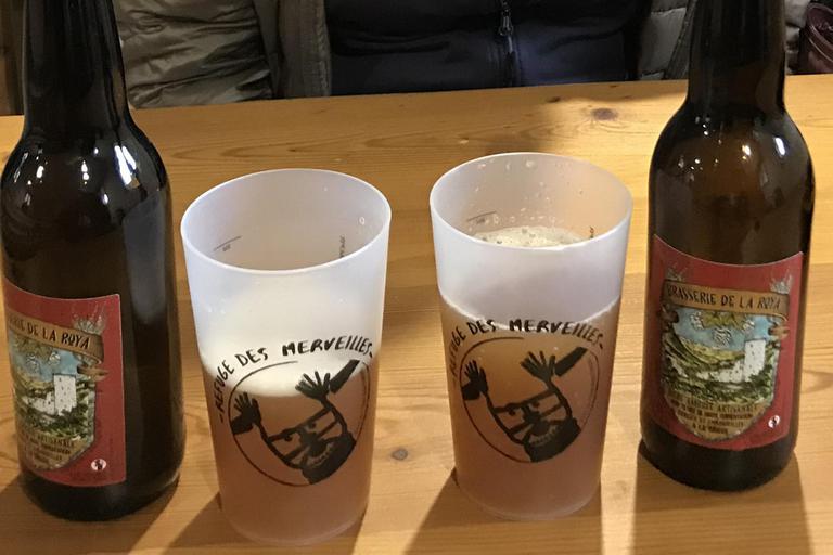 Nous faisons une pause au refuge. Pour nous remettre de cette déception, nous nous offrons deux bières brunes de la microbrasserie de la Roya. Nous n'aurons pas vu le sorcier mais nous aurons au moins les gobelets du refuge à son effigie en souvenir...