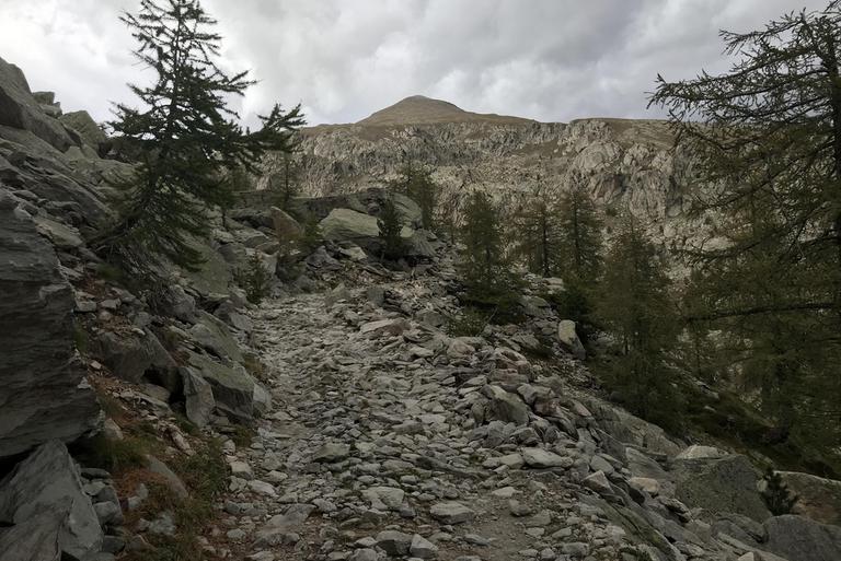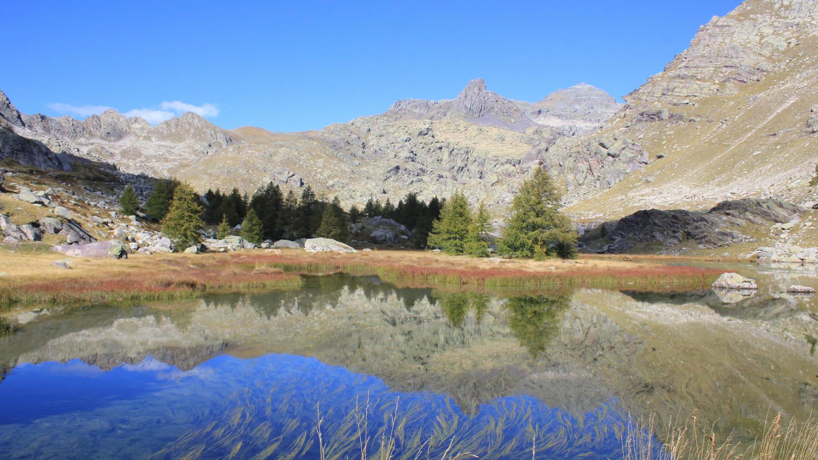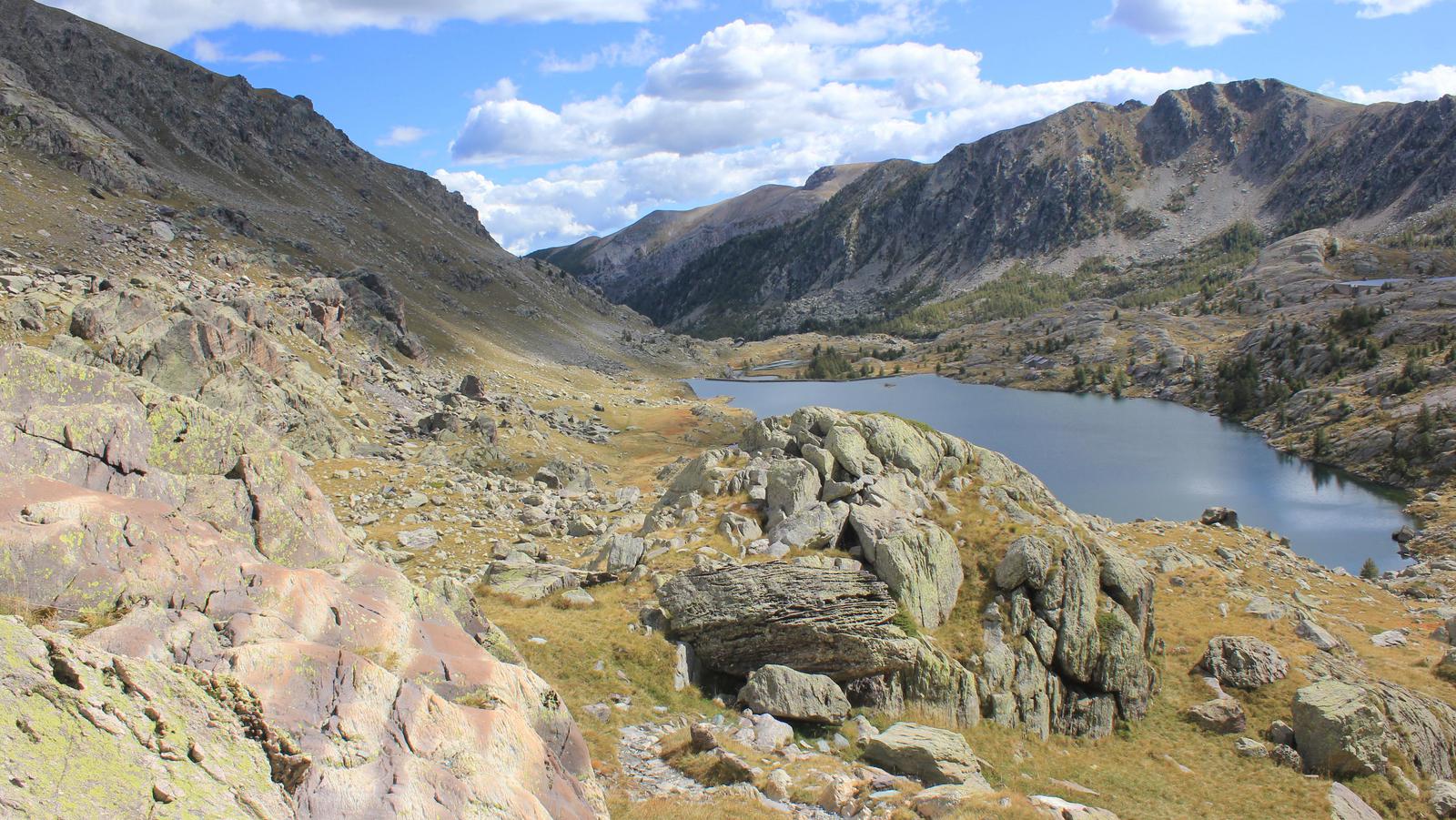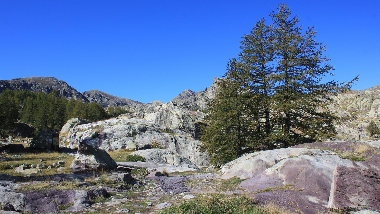 Une fois franchi ce passage éprouvant, nous découvrons un premier plateau couvert de mélèzes, puis un univers beaucoup plus minéral, constitué des fameuses roches sédimentaires vertes et violettes, dont nous avons vu des échantillons au musée des Merveilles. Nous arrivons au lac long inférieur, le mont Bégo est juste au dessus de nous.
