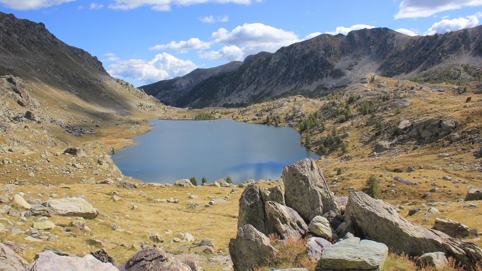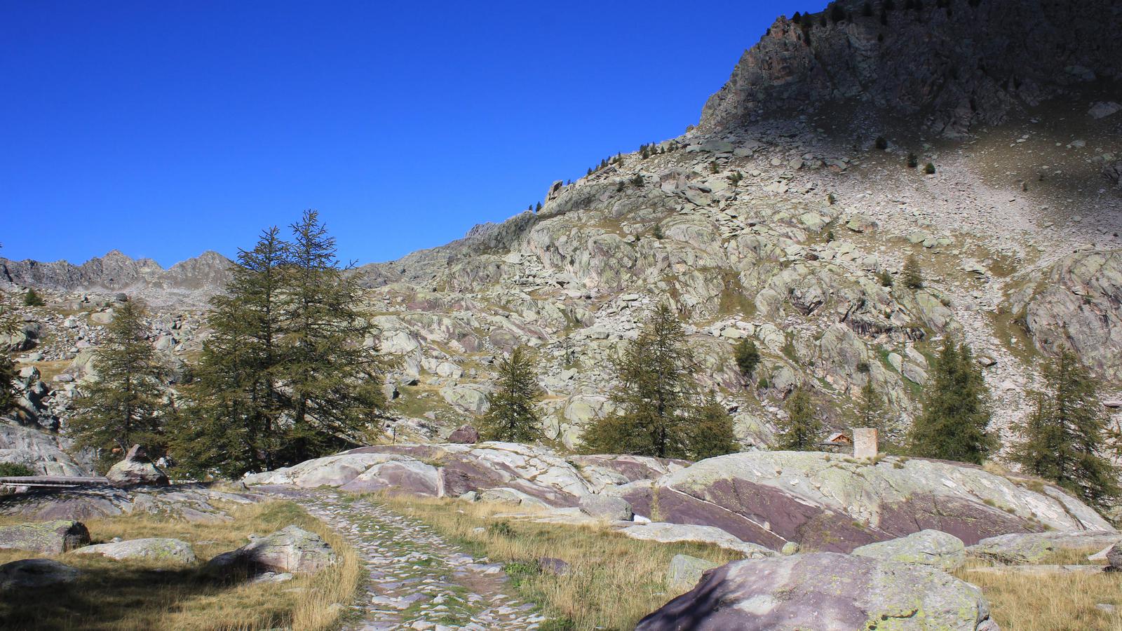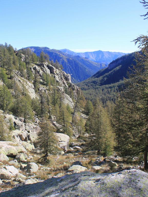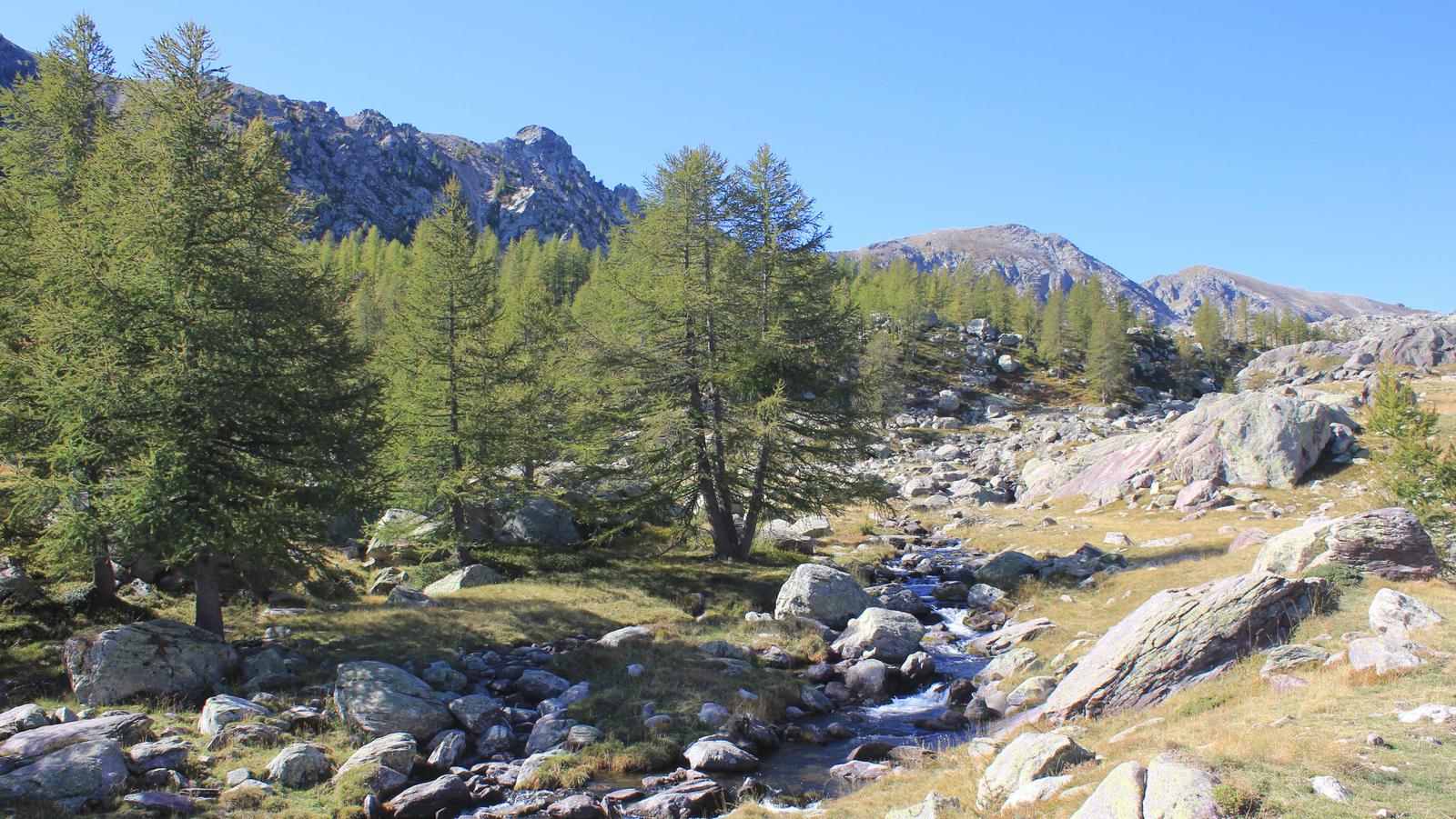 Une fois franchi ce passage éprouvant, nous découvrons un premier plateau couvert de mélèzes, puis un univers beaucoup plus minéral, constitué des fameuses roches sédimentaires vertes et violettes, dont nous avons vu des échantillons au musée des Merveilles. Nous arrivons au lac long inférieur, le mont Bégo est juste au dessus de nous.