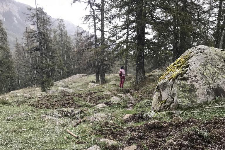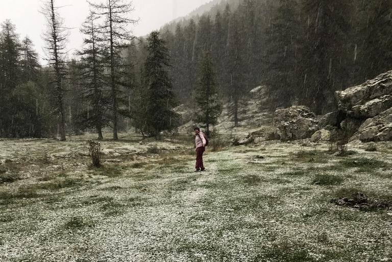 En une demi-heure, la météo a radicalement changé. Le ciel est maintenant totalement couvert puis il se met à neiger. Par sécurité, nous renonçons à descendre par le sentier le long du torrent et choisissons de rester sur la piste. Le retour sera encore plus long...