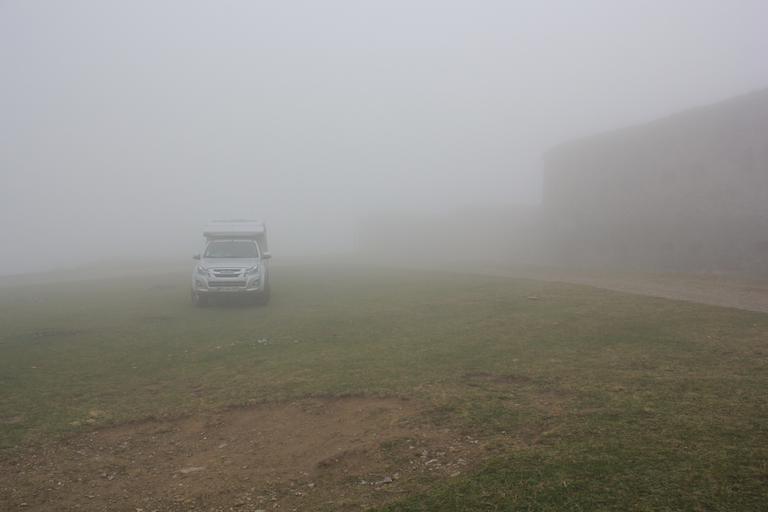 Le soleil qui ne nous a pas quitté de la journée disparaît peu à peu derrière les nuages à mesure que nous montons vers le col. Au sommet, nous nous installons devant le fort central à 1910m d'altitude, soudain le brouillard enveloppe tout le paysage et il se met à pleuvoir. Notre chance, nous connaissons les lieux pour y être venus en 2016... www.voyages-campingcar.fr