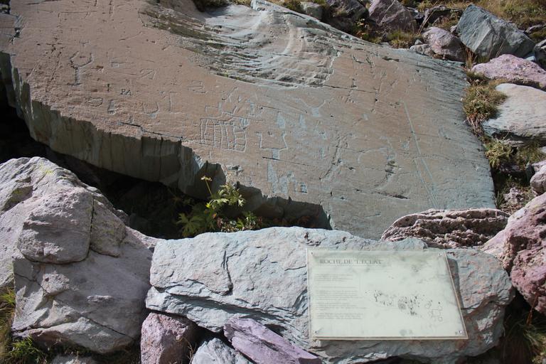 Plus bas, nous découvrons une gravure qui nous avait échappé à l'aller, La Roche de l'Eclat. Elle est très représentative des gravures de la région car elle comporte chaque type de motifs présents dans la vallée.