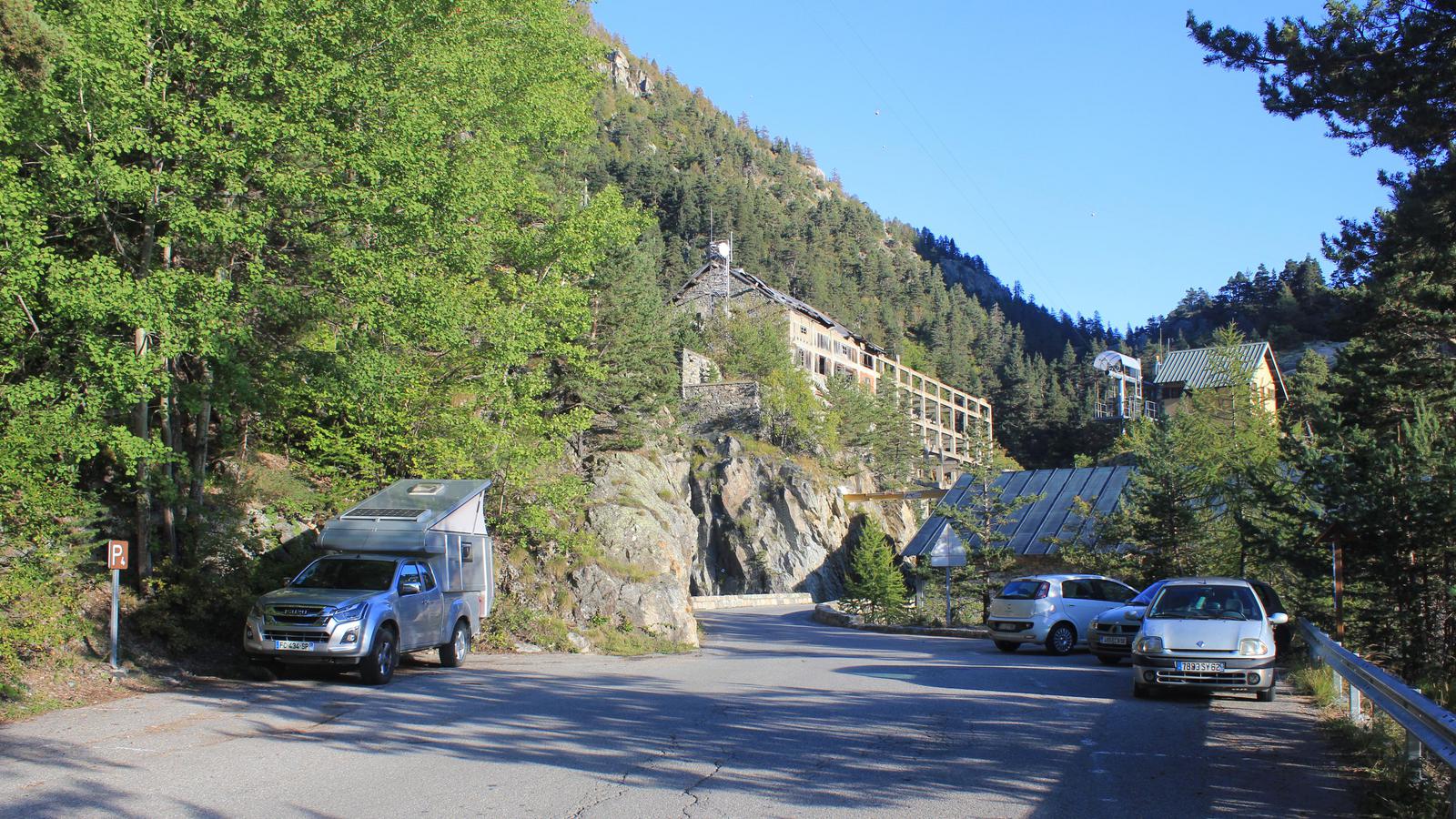 Nous atteignons le lac des Mesches sans encombre. C'est un lac artificiel situé à 1 370m, construit par les italiens en 1915. Les abords du lac sont assez décevants, occupés par des installations hydrauliques et une énorme construction industrielle à l'abandon. Les possibilités de stationnement sont réduites, cela ne nous arrange pas car nous avons prévu de rester ici pour la nuit. Sans autre alternative, nous nous résignons à nous stationner le long de la route et partons pour la balade.