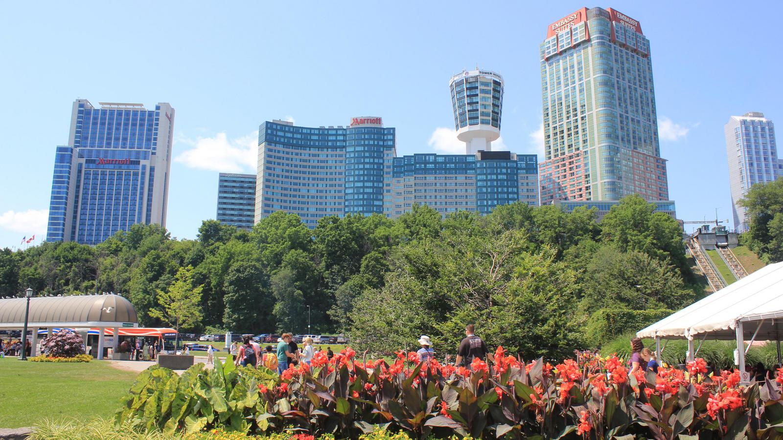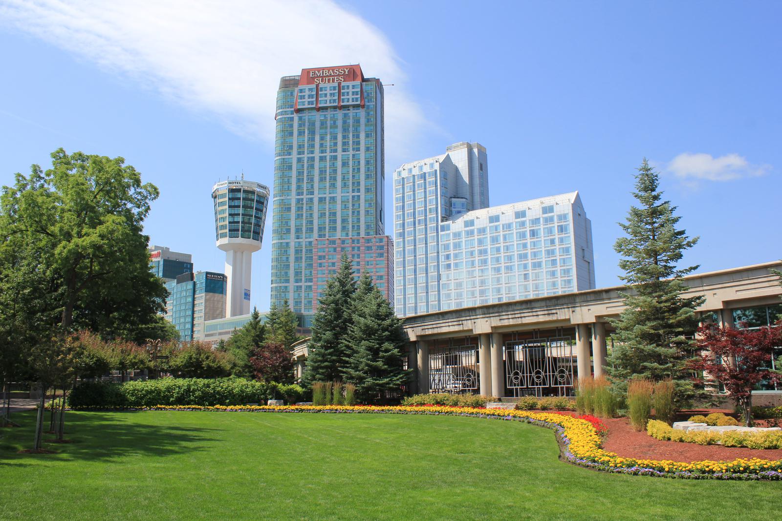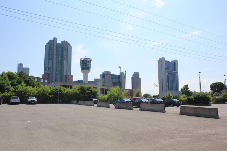 Nous arrivons à Niagara Falls. Nous traversons une zone pavillonaire, puis une zone commerciale et débouchons devant un ensemble de tours et de gros immeubles particulièrement laids. Les chutes ne sont plus loin, nous sommes devant la partie arrière des hôtels dont les façades principales sont orientées face aux chutes.