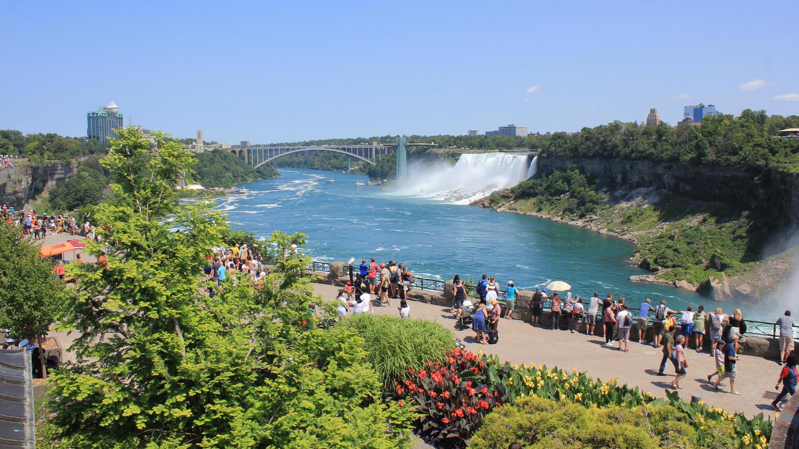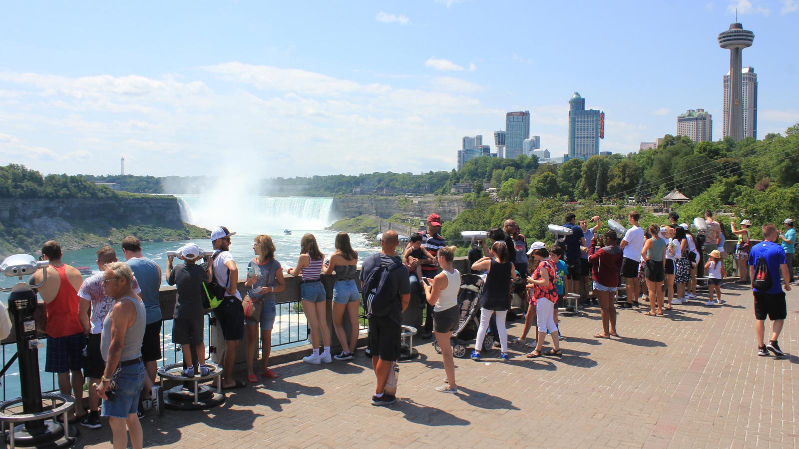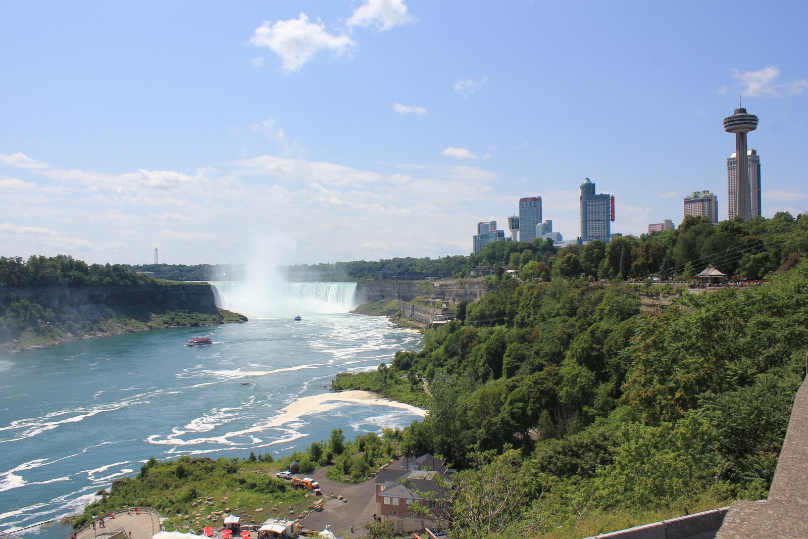 La rive canadienne offre l'avantage d'une vue totale et de face des chutes, en revanche l'exploitation touristique y est à son comble et on ne compte plus les attractions payantes organisées sur le site : casino, croisière aux pieds des chutes, ascenseurs et passerelles permettant de passer sous les chutes, tour et restaurants panoramiques, tyroliennes et enfin la plus insupportable pour ceux qui restent au sol, le tour en hélicoptère et ses navettes incessantes...