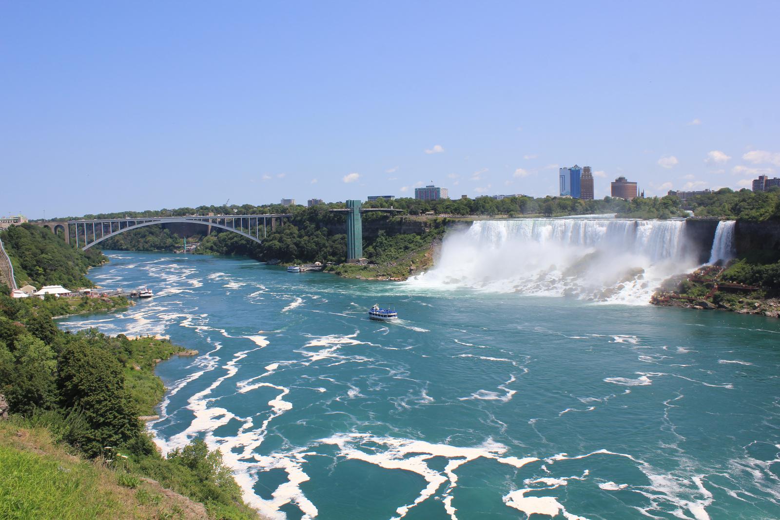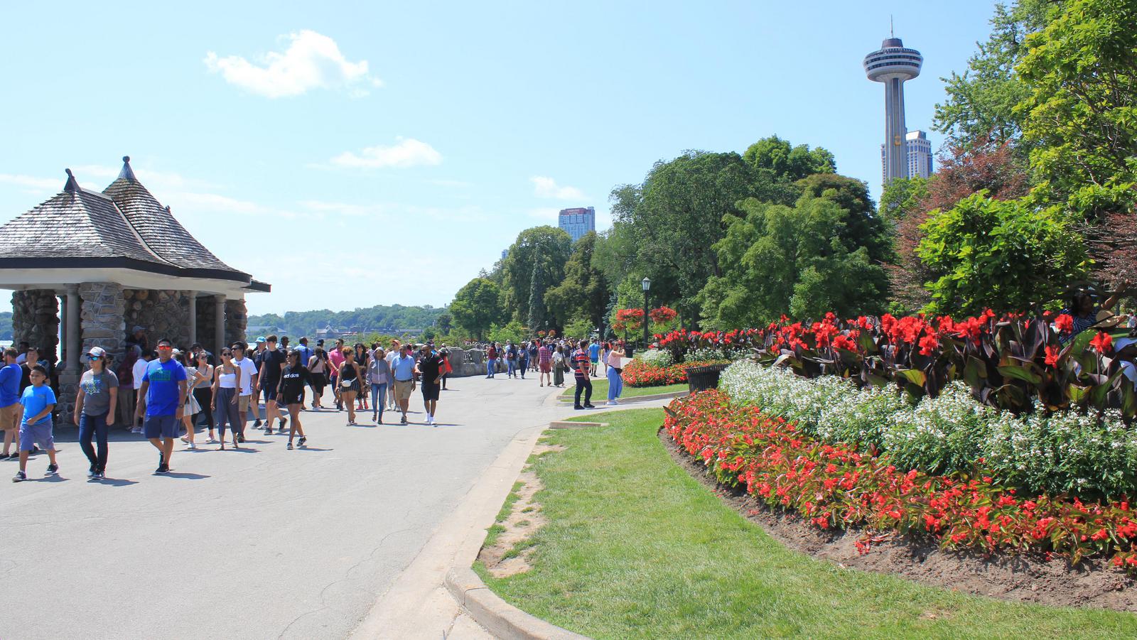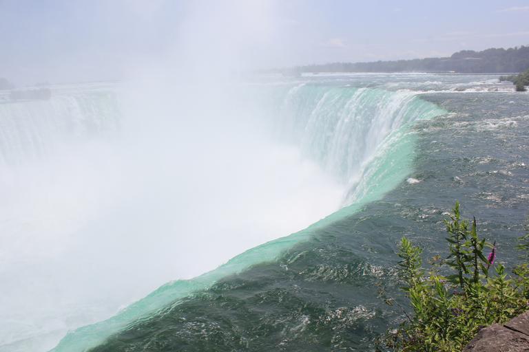 La rive canadienne offre l'avantage d'une vue totale et de face des chutes, en revanche l'exploitation touristique y est à son comble et on ne compte plus les attractions payantes organisées sur le site : casino, croisière aux pieds des chutes, ascenseurs et passerelles permettant de passer sous les chutes, tour et restaurants panoramiques, tyroliennes et enfin la plus insupportable pour ceux qui restent au sol, le tour en hélicoptère et ses navettes incessantes...