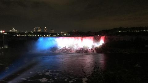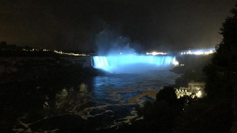 Nous dînons, puis partons voir l'éclairage nocturne des chutes. Il y a énormément de touristes, et nous suivons le flot dirigé par la police. La large allée en forme de balcon devant les chutes est noire de monde, nous essayons de nous faufiler pour en voir un peu plus, lorsque soudain éclate la première fusée d'un feu d'artifice...