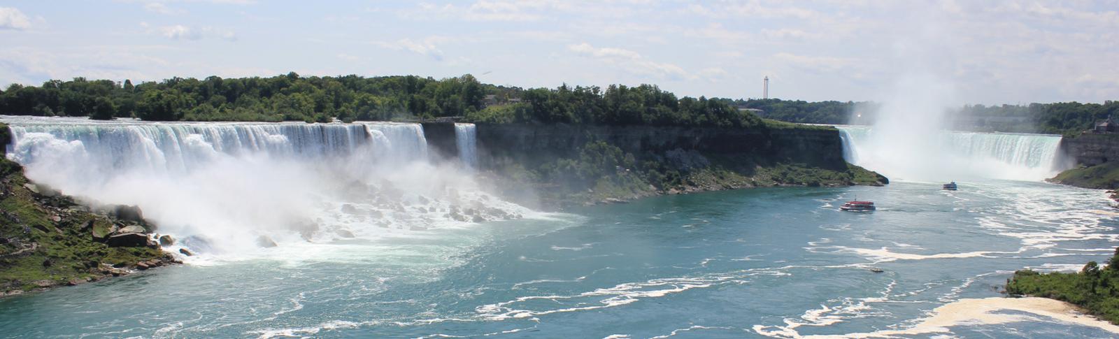 Les chutes se situent sur la rivière Niagara reliant le lac Erie au lac Ontario. Elle marque la frontière entre le Canada et les Etats-Unis. Elles se divisent en 3 secteurs, de gauche à droite sur la photo : l'American Falls côté américain, Bridal Veil Falls (la chute du voile de la mariée), petite chute à droite de la première, et enfin Horseshoe Falls, la chute du fer à cheval, côté Canada.