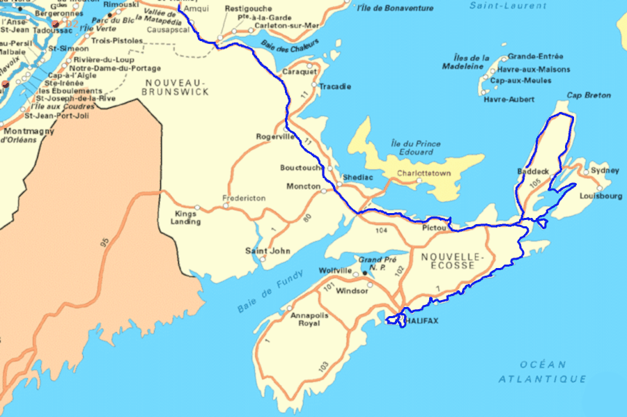 Nous avons fait beaucoup de kilomètres ces derniers jours, après réflexion, nous décidons de faire l'impasse sur l'île Prince Edward, pour laquelle nous n'avons aucune information et sur laquelle nous ne ferions que passer. Nous prenons l'option de filer directement vers la Gaspésie. Nous suivons la côte, puis bifurquons vers Amherst, dernière ville de Nova Scotia. Nous entrons dans le Nouveau Brunswick.