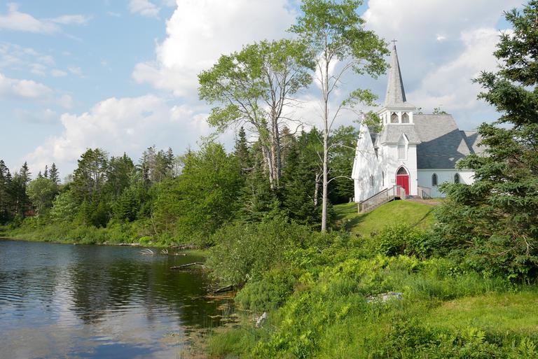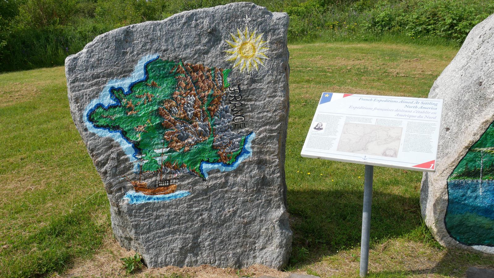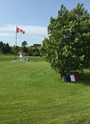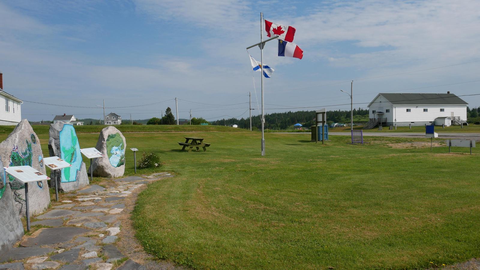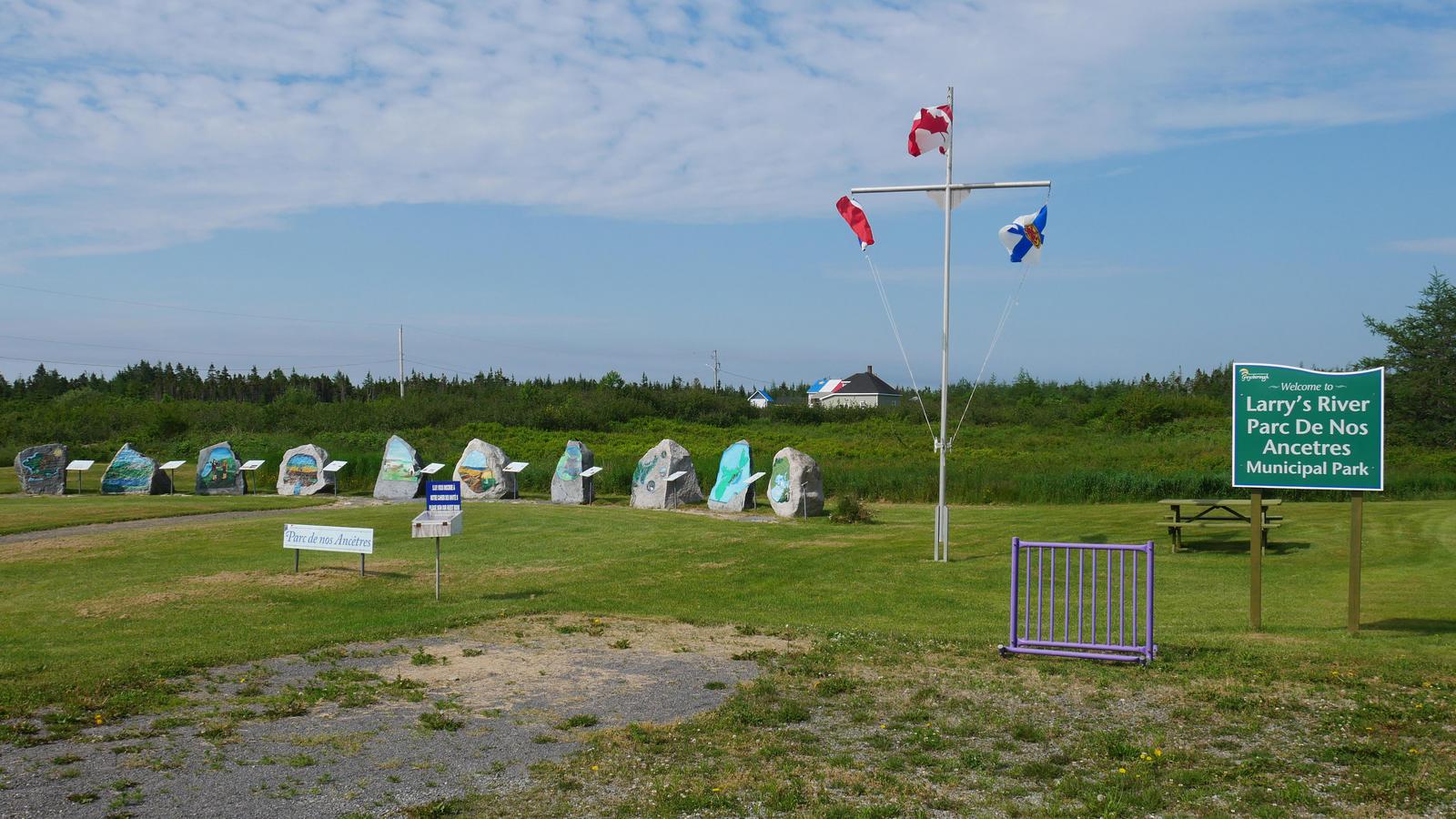 Aujourd'hui, nous partons pour l'île Cap Breton, l'extrémité nord de la Nouvelle Ecosse. Nous n'allons pas jusquà Canso, la fin de l'itinéraire de la Marine Drive, mais coupons en direction de Guysborough par Larrys River. Cette dernière localité est le premier village acadien que nous traversons. Les maisons sont plus simples, rassemblées autour de l'église et du monument qui rend hommage aux ancètres. Le drapeau acadien cotoie le canadien, c'est celui de la France avec une étoile dorée à cinq branches en haut de la bande bleue.