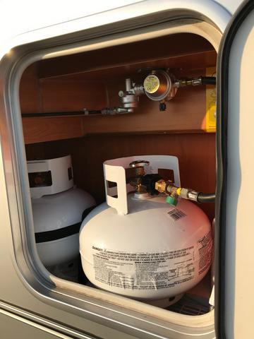 Un magasin Canadian Tire, plus axé bricolage, est implanté juste à côté. A la fin du repas, je consulte sur mon smartphone le site de celui-ci ; Alors que je recherche en vain sur internet depuis des semaines, des bouteilles de gaz pouvant entrer dans notre coffre conçu pour des Elfi, je m'aperçois que Canadian Tire vend des bonbonnes rechargeables paraissant tout à fait compatibles... Mètre en poche je file au magasin.