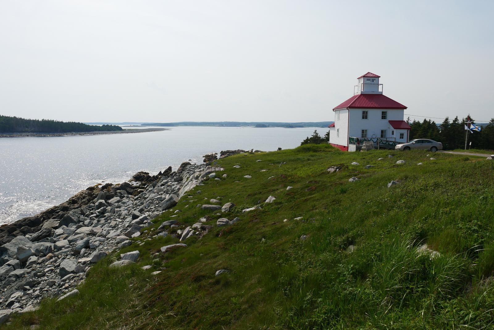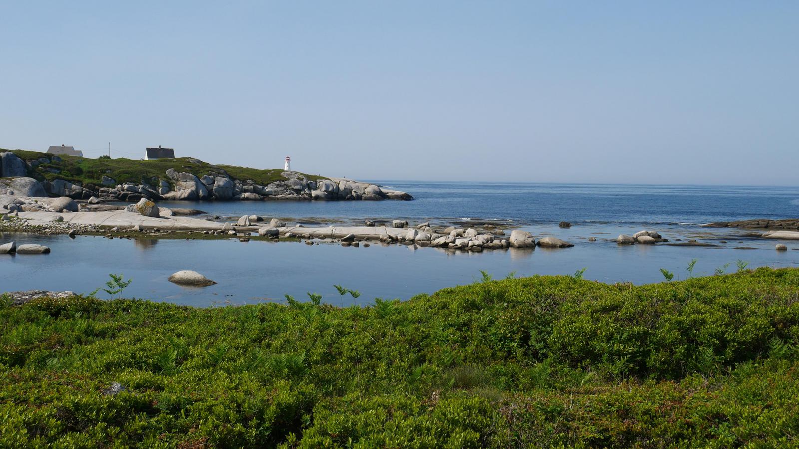 Nous longeons la St Margarets Bay mais nous n'apercevons que très rarement la mer tant la végétation est dense. Cela fait tout de même du bien de quitter les embouteillages d'Halifax, une ville où la circulation est finalement bien difficile. En revanche, les habitations se suivent sur la 333 et il est pratiquement impossible de s'arrêter. La végétation disparaît, nous arrivons à la pointe et apercevons le phare de Peggys Cove.