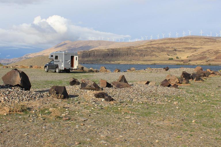 Nous roulons avec les éoliennes des crêtes des gorges de la rivière Columbia en ligne de mire et la nuit est tombée lorsque nous arrivons sur les rives de celle-ci. Nous rejoignons l'aire de camping gratuite de Rufus.