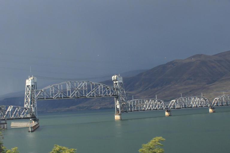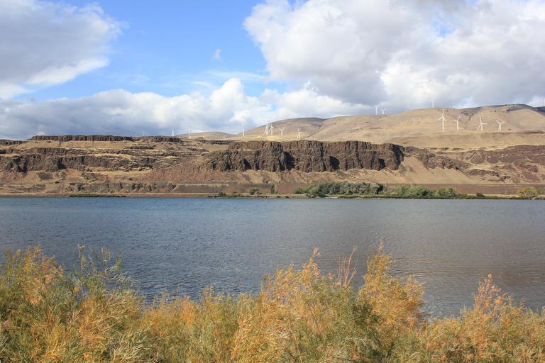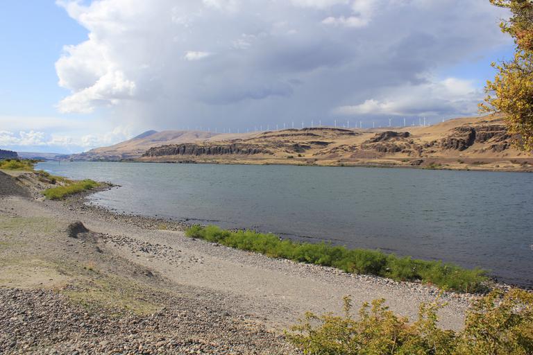 L'aire de camping est immense, juste en aval du barrage John Day et de la jonction entre la John Day River que nous avons suivie la veille et la Columbia River. En plein été, c'est un spot apprécié des kitesurfeurs. Nous sommes dans les gorges, celles-ci sont très larges et outre la rivière, cette voie de passage naturelle est empruntée par deux doubles voies ferrées, deux routes et une autoroute. De l'autre côté du fleuve, l'état de Washington.