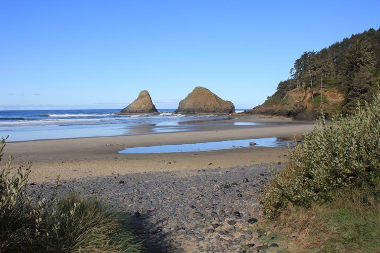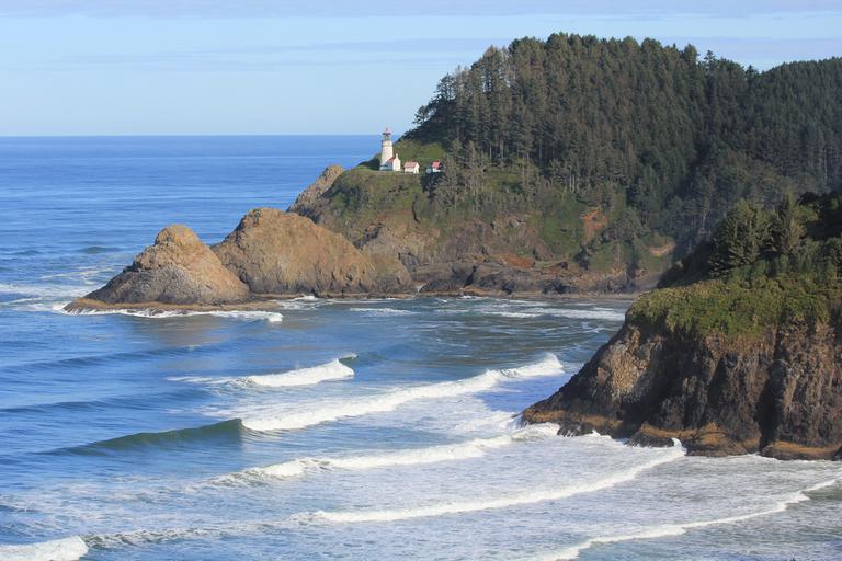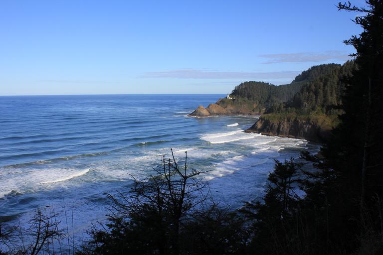 Nous suivons la côte jusqu'au phare d'Heceta. Celle-ci est très belle, les plages de sables alternent avec des pointes rocheuses. La montagne plonge dans l'Océan, la végétation constituée essentiellement de pins déformés par les vents, est luxuriante et couvre tous les chemins et partiellement la route. Comme prévu, ce soir, nous avons droit à un coucher de soleil...