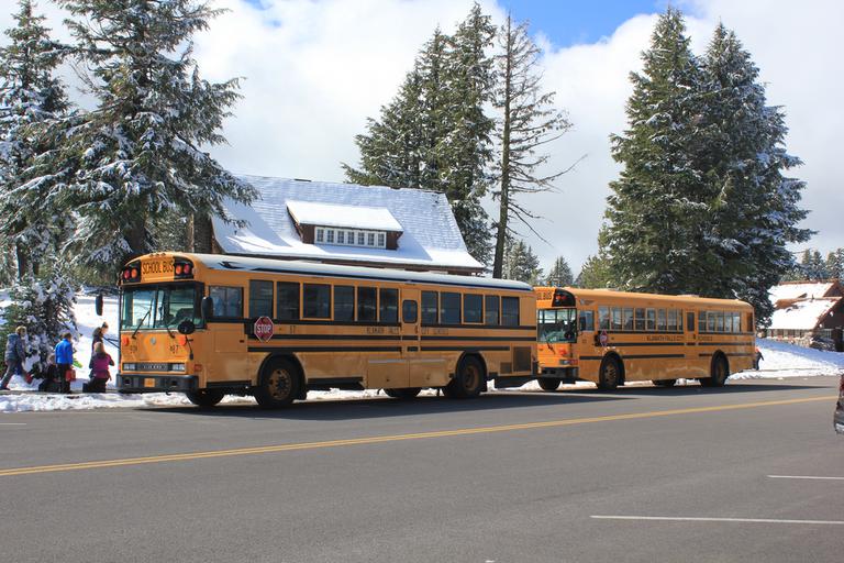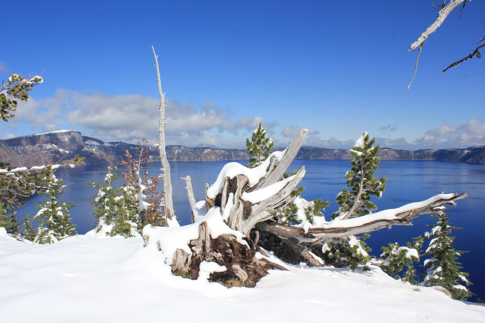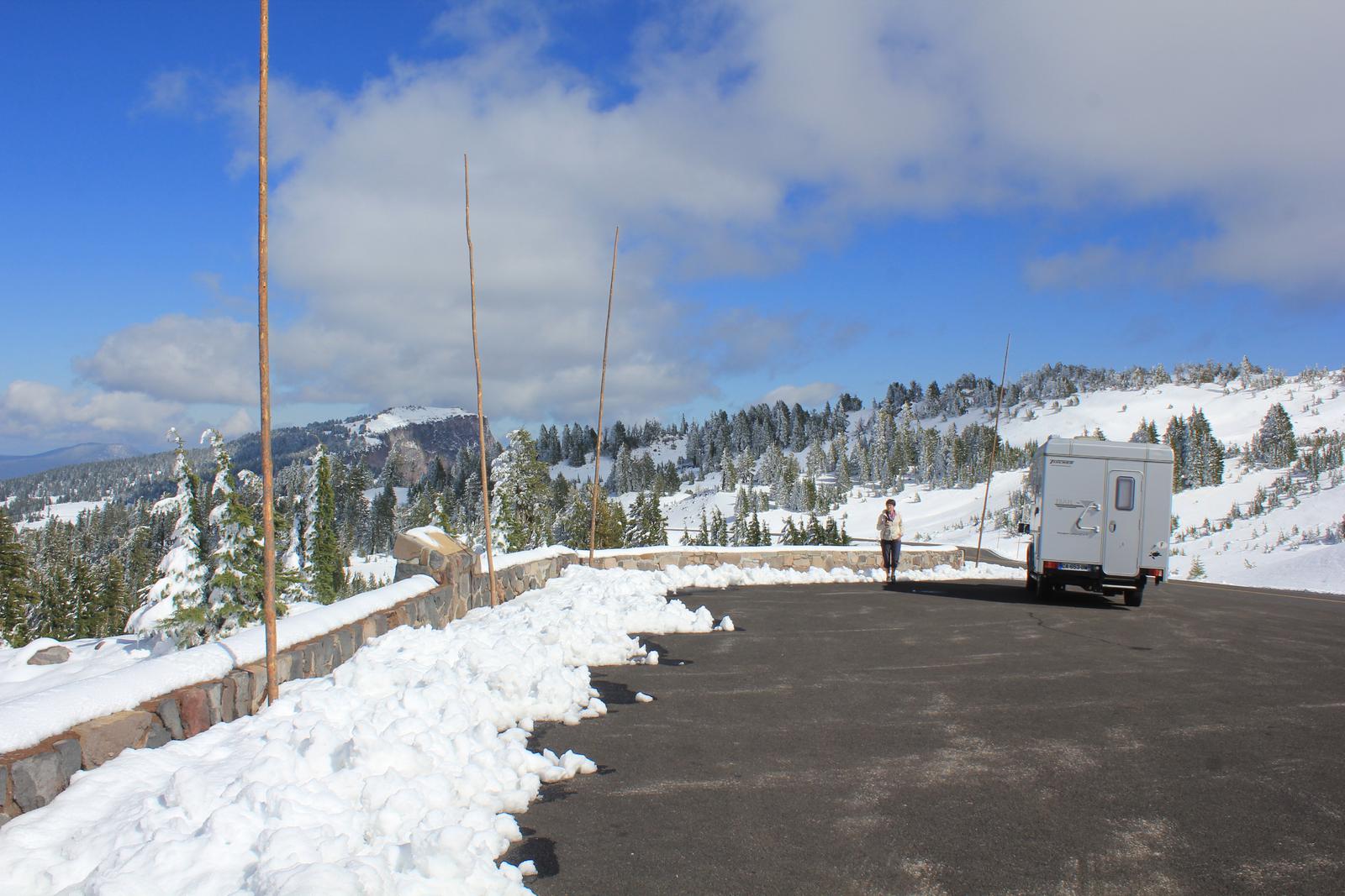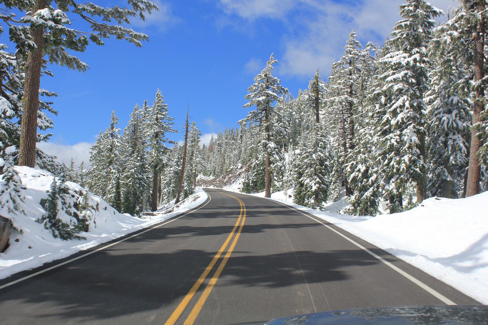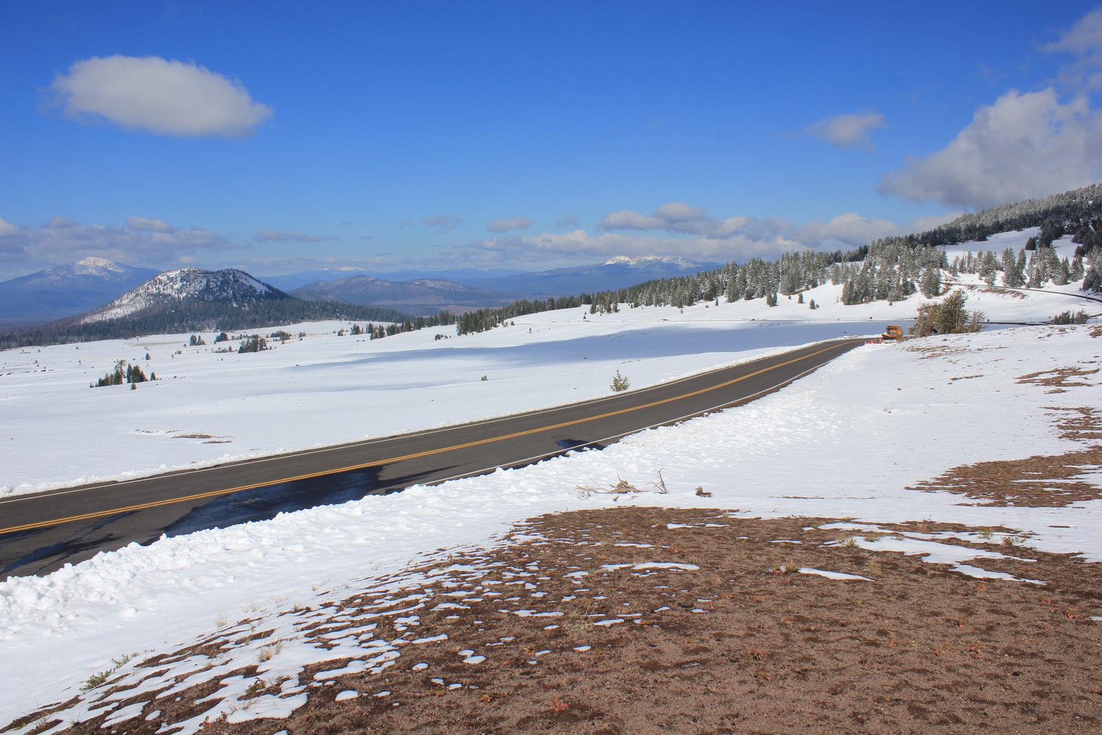 La journée s'annonce belle, nous quittons rapidement notre bivouac pour rejoindre Crater Lake. Une mauvaise surprise nous attend cependant au bout de 130 kilomètres : avec les chutes de neige de cette nuit, l'entrée nord-ouest du parc est fermée...