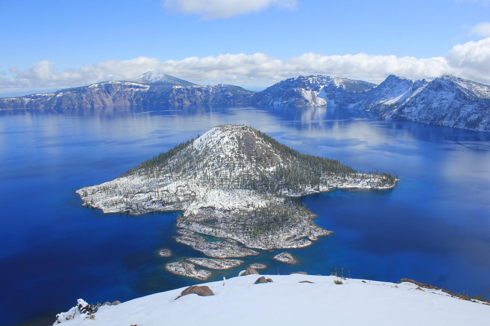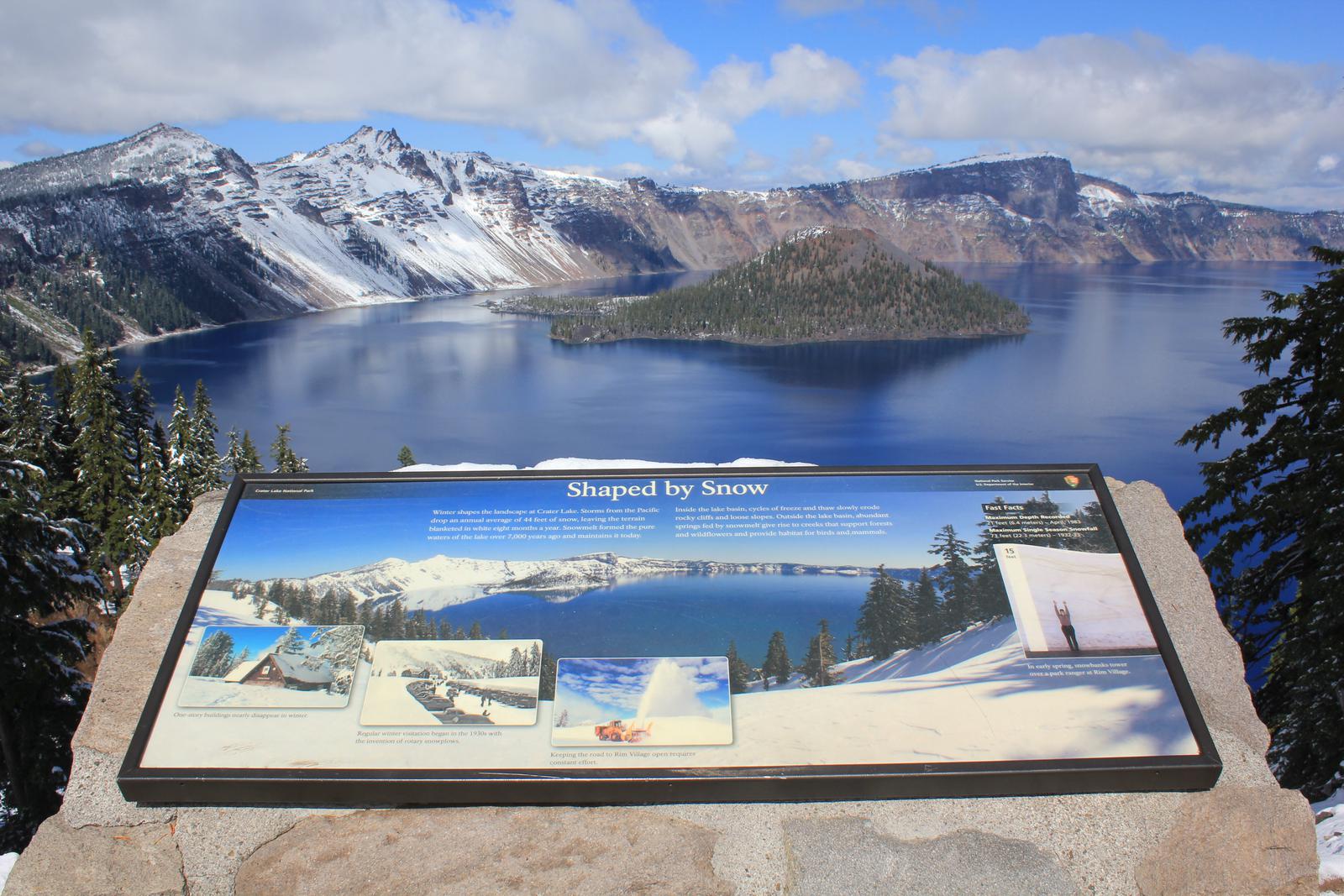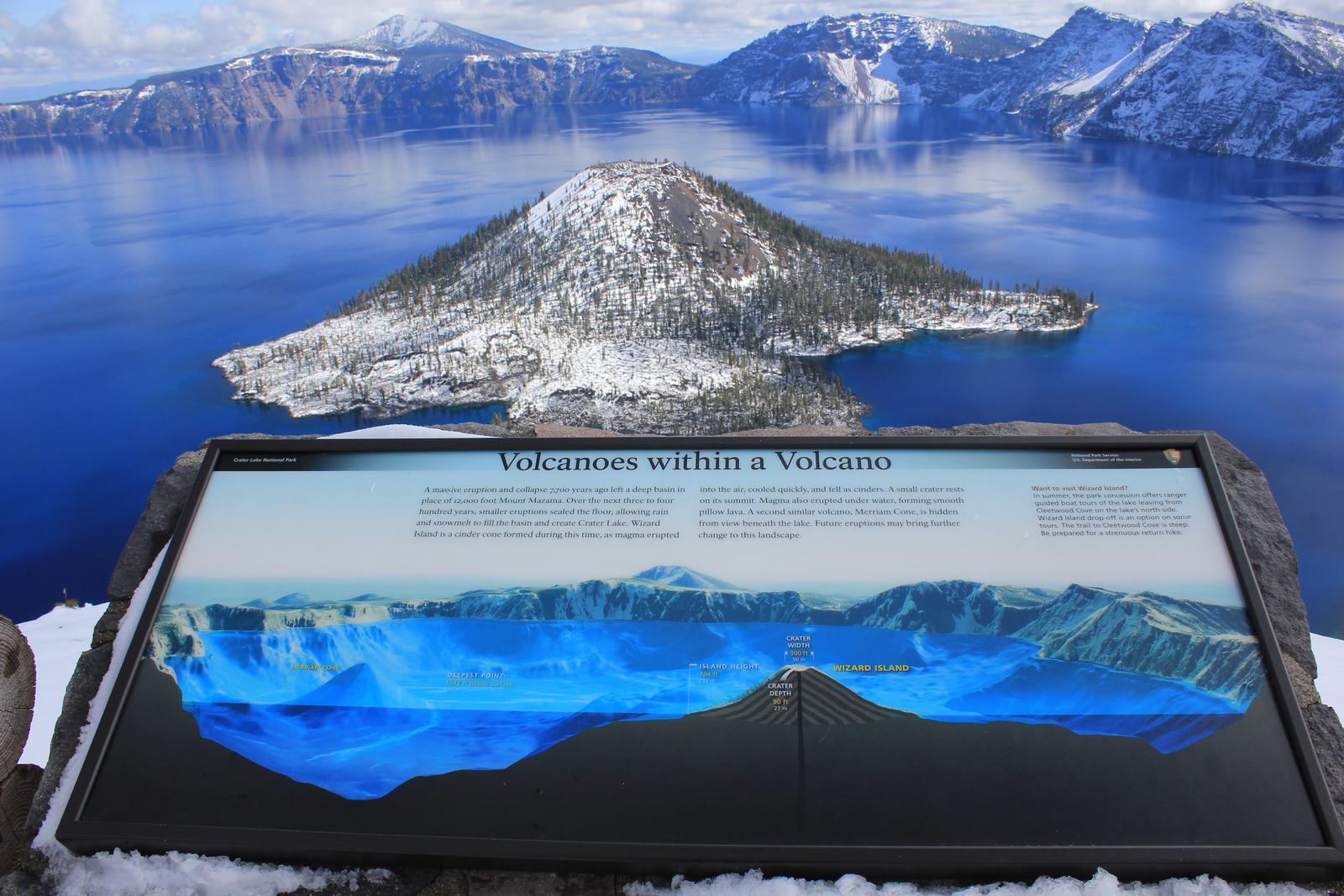 L'histoire de ce site est exceptionnelle : le mont Mazama était un volcan de la chaîne des Cascades. Au fil de ses éruptions, la lave s'est accumulée pour créer un cône de 3 550m d'altitude. Il y a 7 700 ans, une éruption plus intense que les précédentes, projeta sa partie supérieure, tandis que sa partie intérieure s'effondra pour former une profonde caldera. Celle-ci finit par se remplir au fur et à mesure des précipitations. Durant ce temps, une île volcanique émergea des eaux, l'île Wizard.