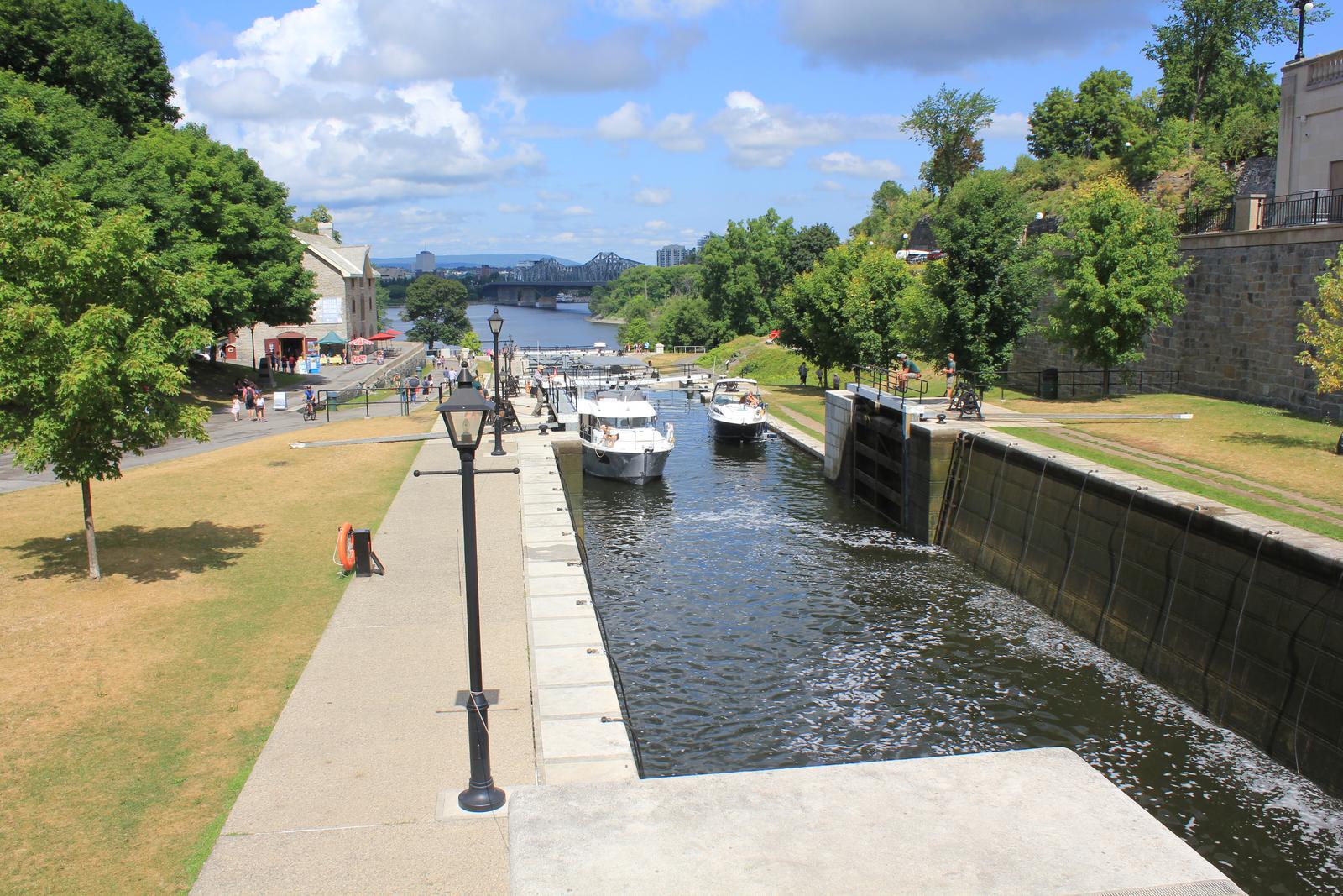 Arrivés sur l'autre berge, nous rejoignons le pied des huit écluses du canal Rideau. Cette voie navigable, toujours en service pour les bateaux de plaisance, relie Ottawa au lac Ontario. il a été achevé en 1832 et reste aujourd'hui le plus vieux canal d'Amérique du Nord. Il est inscrit au patrimoine mondial de l'humanité par l'UNESCO en 2007.