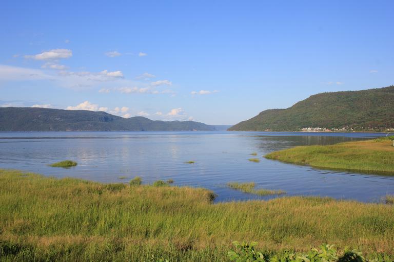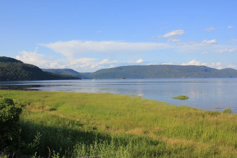 Nous revenons en arrière et poursuivons jusqu'à L'Anse-Saint-Jean. Nous laissons à nouveau la route 170 pour rejoindre le port implanté dans une large baie et dénicher le parking indiqué sur Ioverlander. Ce dernier est bien là, mais quelques prés se trouvent aussi dans cette très jolie anse et le paysan vient de profiter du beau temps pour répandre son lisier... La route s'achève en cul de sac devant la barrière du parc naturel, pas de bivouac de ce côté-là, nous devons faire demi tour et decendre les côtes à 15 et 17% que nous venons de monter...