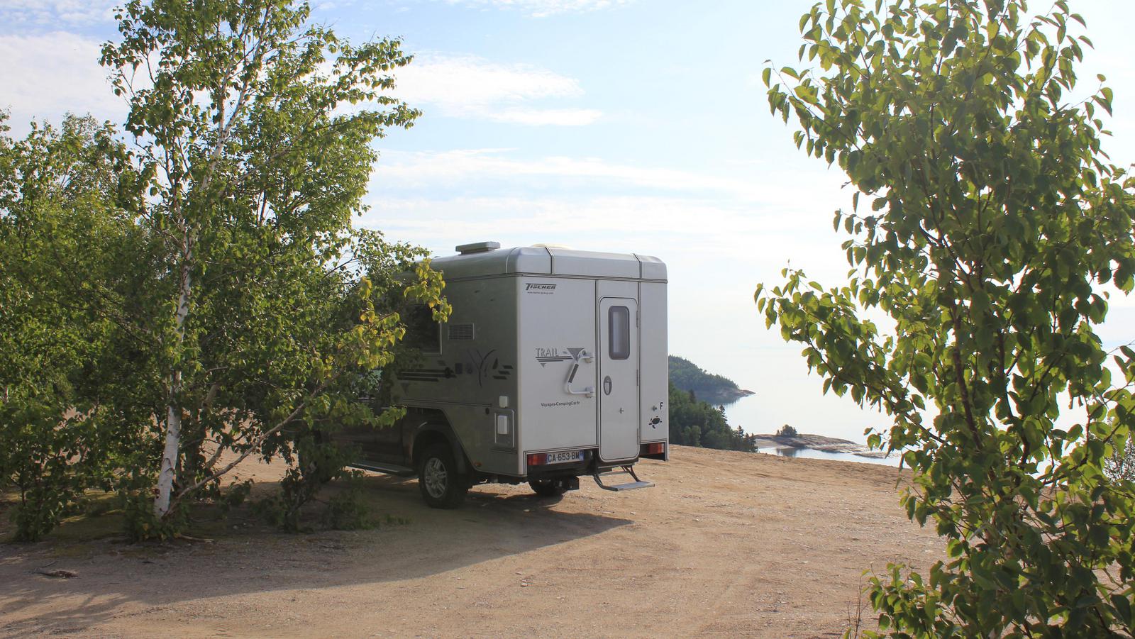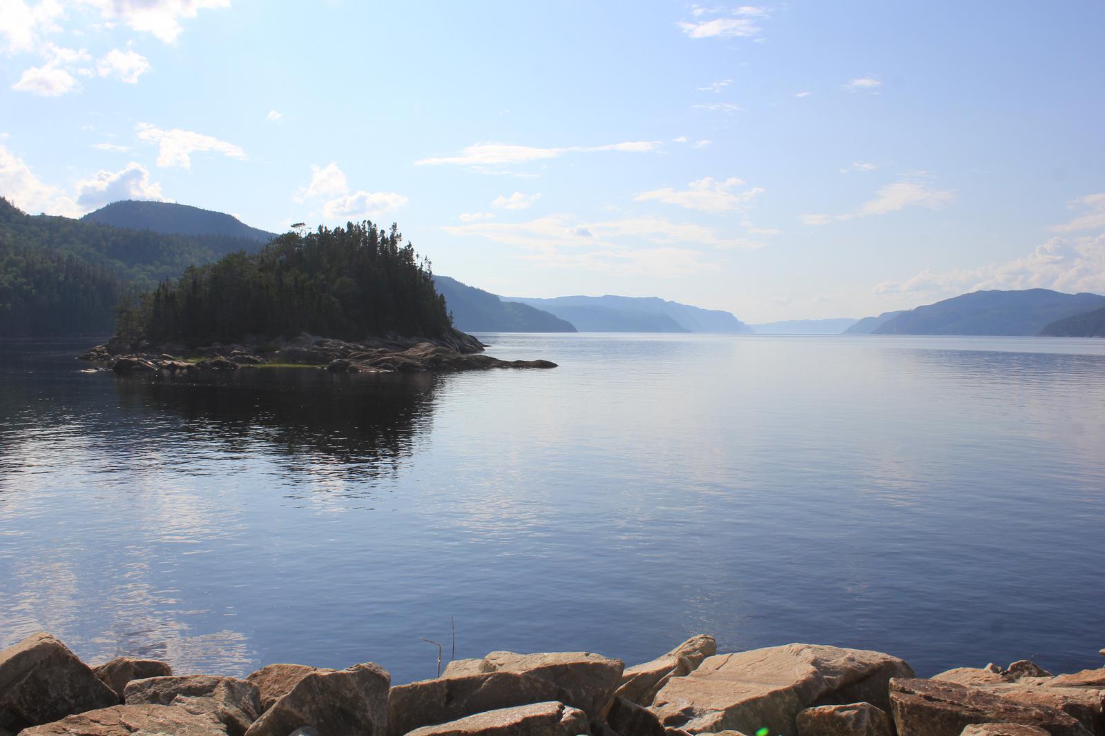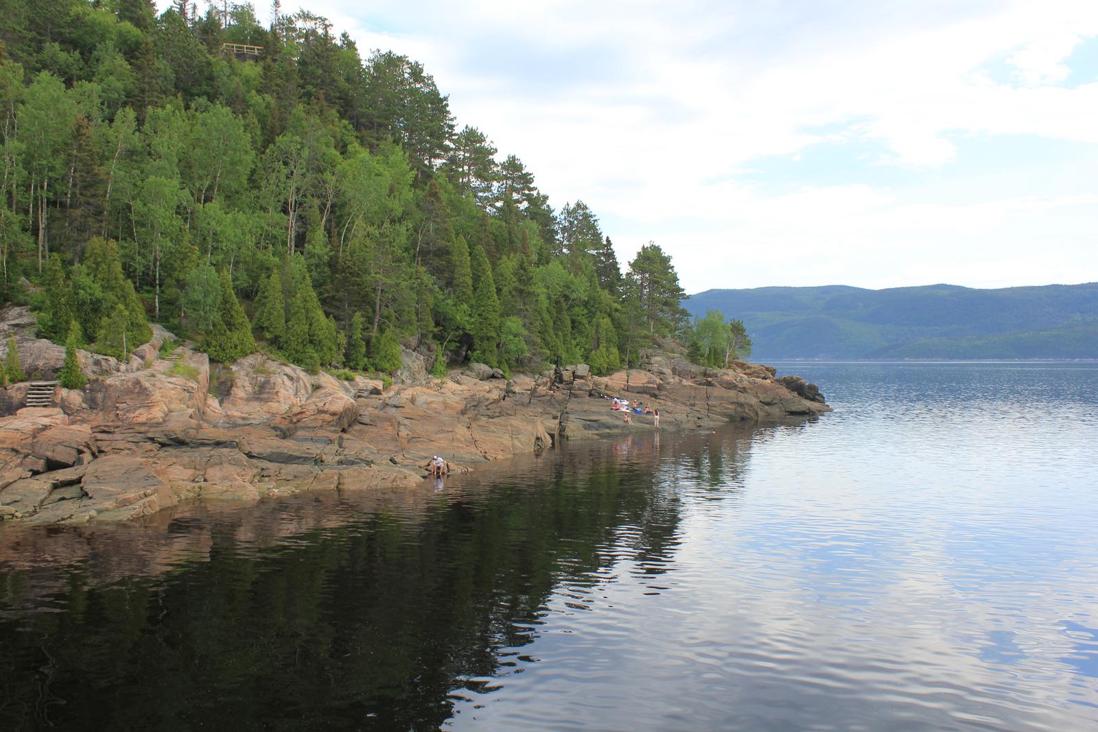 Nous cherchons maintenant notre lieu de bivouac. Nous tentons notre chance en vain du côté du parc de la baie Sainte-Marguerite, sur le fjord Saguenay, avant de revenir à l'Anse de Roche, toujours sur ce même fjord, sur les indications d'un jeune guide français du parc. L'endroit est magnifique, le parking est minuscule mais il reste de la place près d'une autre cellule.