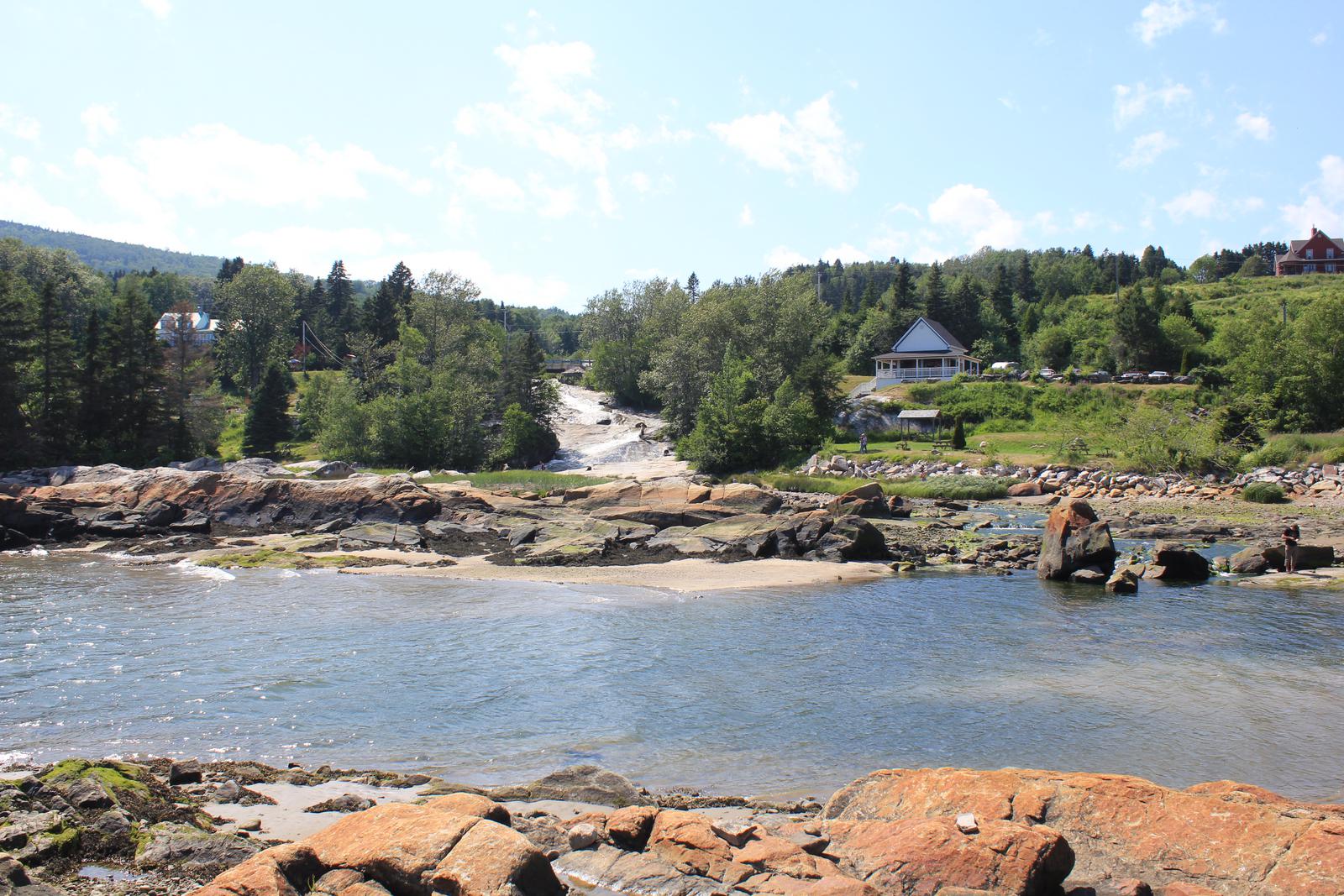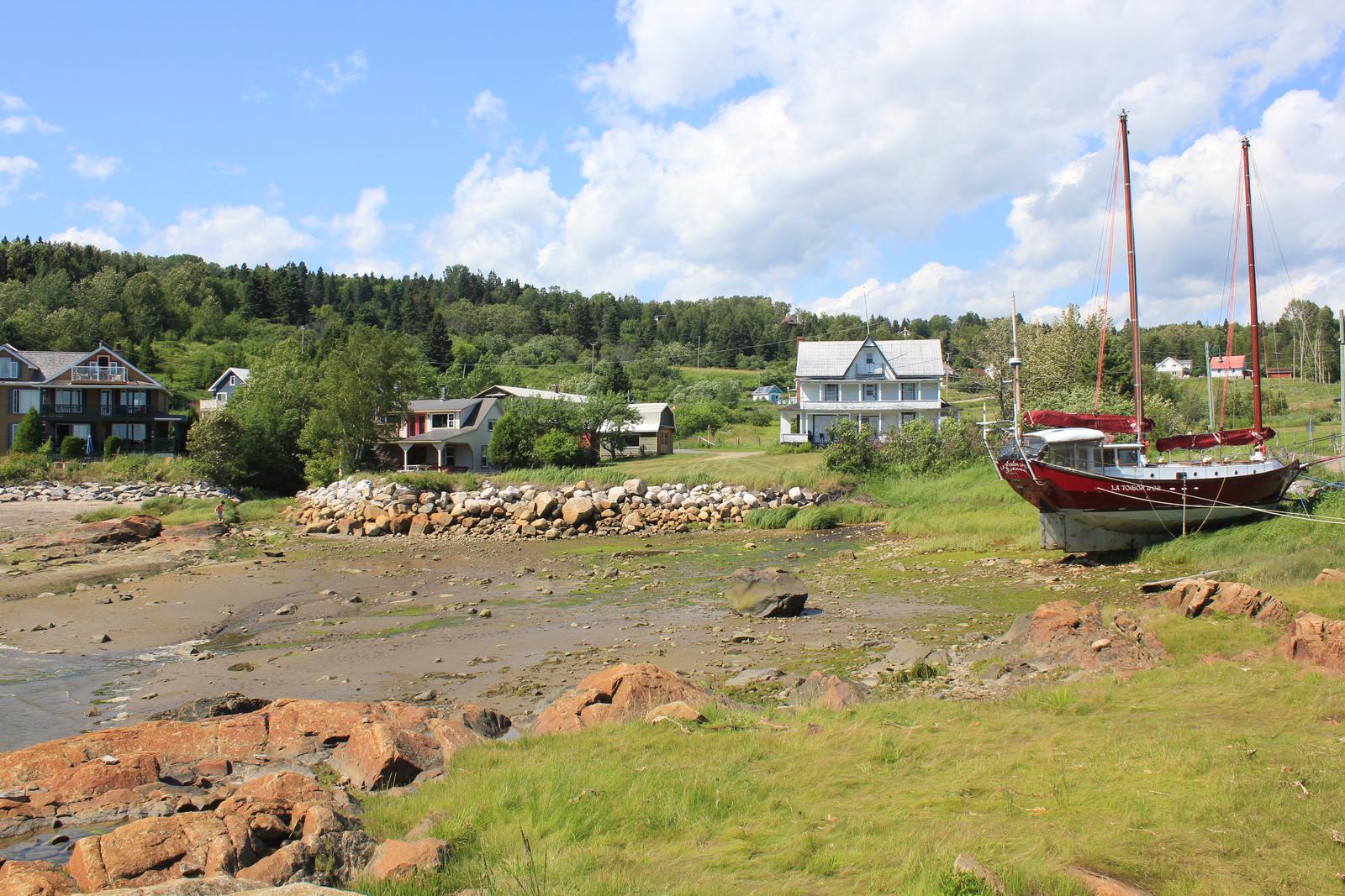 Nous traversons Saint-Simeon puis quittons à nouveau la route 138 pour rejoindre Port-au-Persil, un minuscule port construit en 1870 pour le transport du bois vers les usines de pâte à papier. La marée est encore bien basse, mais la jolie rivière qui tombe en cascade dans le port rend cet endroit bien agréable.