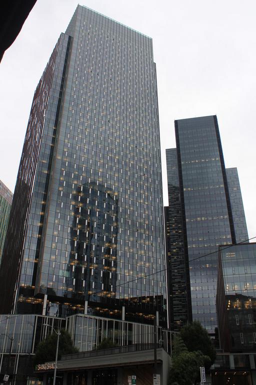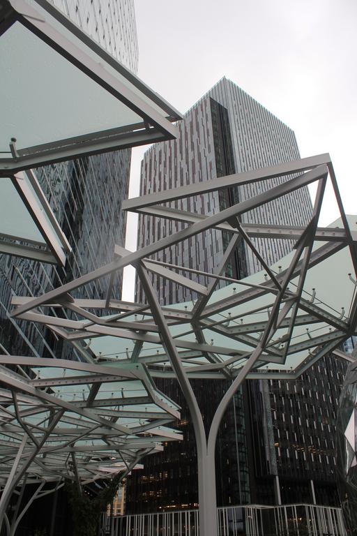 Le quartier est en plein travaux, autour de cet ensemble de tours en verre fumé noir, d'autres immeubles sont en construction ou en rénovation, pour rendre cohérent ce choix de bannir le blanc et les couleurs.