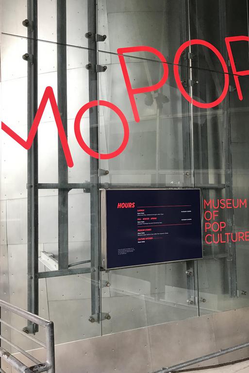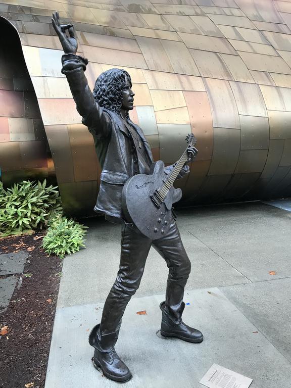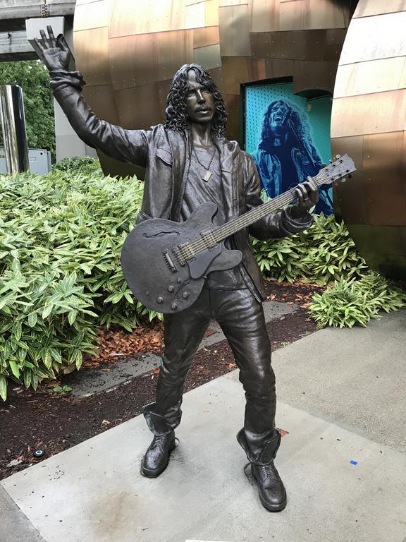 Une statue en bronze se tient devant l'entrée, il s'agit de Chris Cornell, le leader du groupe Soungarden, natif également de Seattle et disparu en 2017.