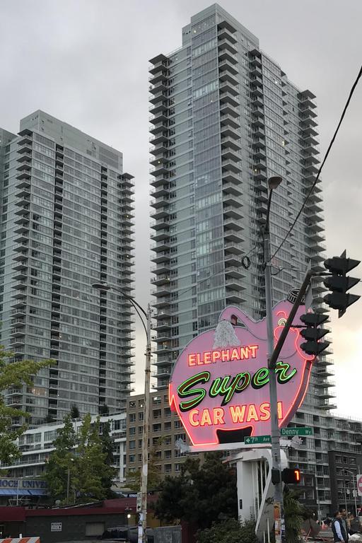 La deuxième raison qui nous a amené à Seattle est la présence du Museum of Pop Culture dessiné par le célèbre architecte Frank Gerhy. Nous suivons la Denny way avec comme point de repère la Space Needle, la tour d'observation de 184 m construite pour l'exposition universelle de 1962. Nous passons devant une enseigne lumineuse tournante d'un carwash, typique des années cinquante, je trouve qu'elle a sa place dans ce nouveau décor mais je crains qu'elle ne disparaisse bien vite...