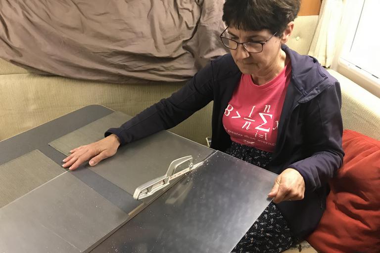 Nous revenons sur nos pas, puis refaisons en vain le trajet en scruptant les talus de l'autoroute. Il va pleuvoir cette nuit, il faut régler ce problème sans délai. Nous rejoignons un Home Depot, les grands magasins de bricolage semblables aux Brico Dépot que nous connaissons en France, j'y achète une plaque de plexiglace et une scie. Nous voilà partis pour deux heures de bricolage sur le parking de la grande surface.