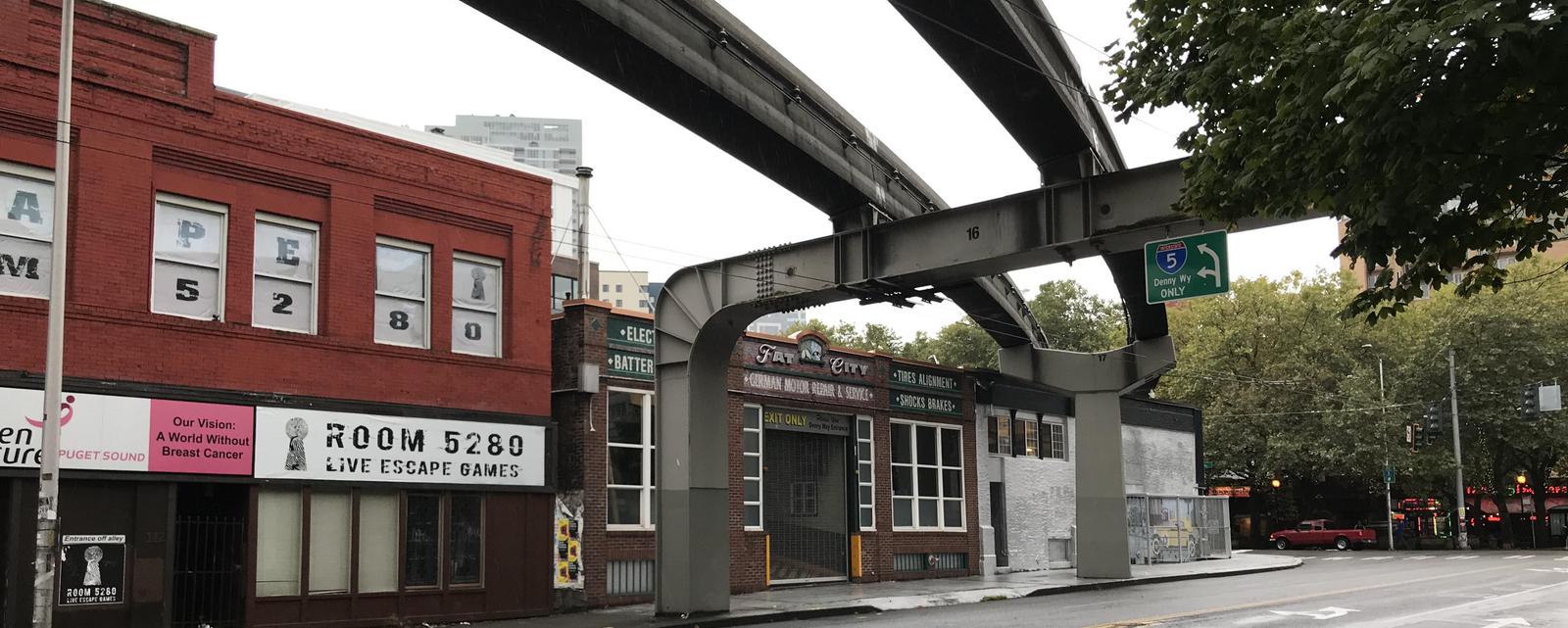 Nous bifurquons sur la 4th Ave, nous apercevons soudain que nous sommes surplombés par les rails en béton des deux voies du monorail datant lui aussi de l'exposition universelle.