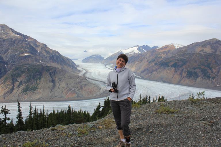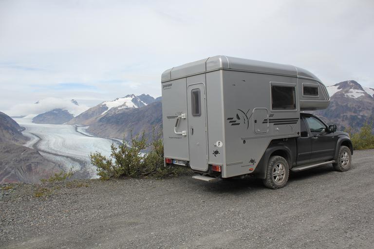 Nous poursuivons en direction du glacier. Nous remontons la Salmon River, la route revient en Colombie Britannique, l'enrobé laisse place à la terre. Nous suivons la piste sur environ 25 km, celle-ci est suffisamment large pour se croiser et en bon état si on excepte quelques passages avec de très gros trous. Nous avons gravi 1 200 m, j' aperçois le glacier lorsque soudain le témoin rouge de la température de l'huile de la boîte de vitesse automatique s'allume. Je m'arrête aussitôt et nous consultons le manuel. Je redémarre, il s'est éteint. Pas pour longtemps, il s'allume à nouveau. Je recommence et roule en seconde, nous arrivons sur le parking du glacier.