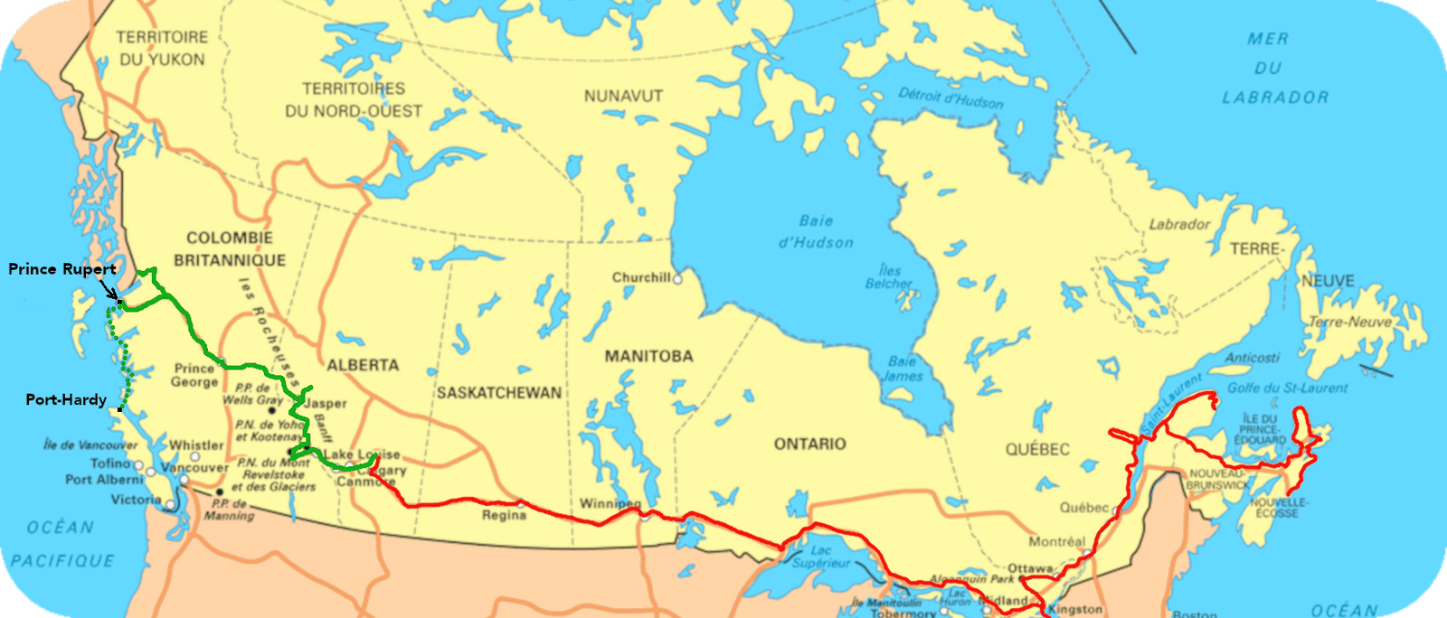 Nous avons parcouru 362 km ce jour, 13 133 km depuis notre arrivée à Halifax.