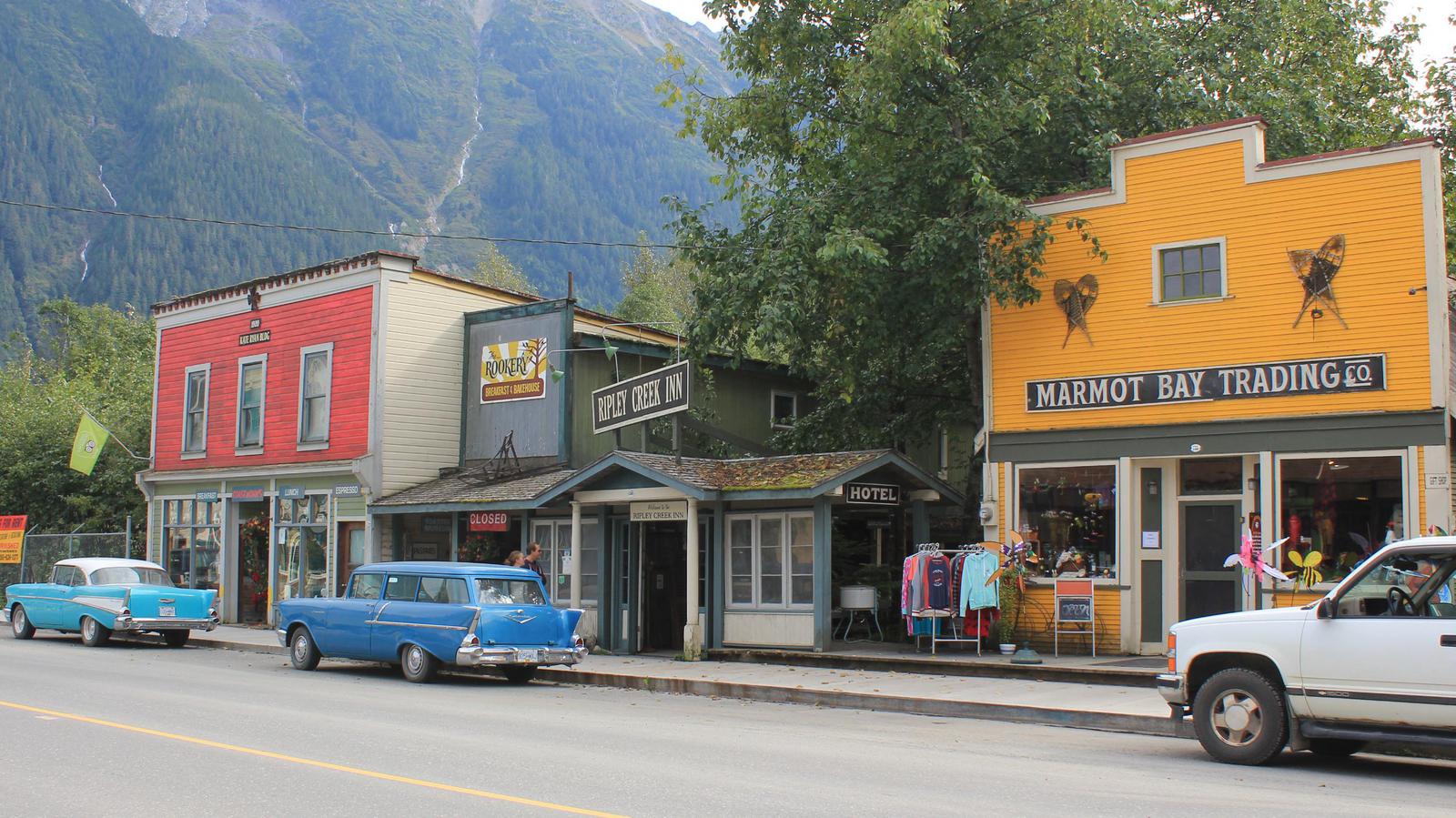 Nous nous arrêtons devant le bureau du tourisme de Stewart car je souhaite savoir s'il y a un garagiste dans la ville. Pas de chance, celui-ci est fermé le lundi ! Nous traversons la rue principale colorée et bien mise en valeur, à la recherche de wifi,