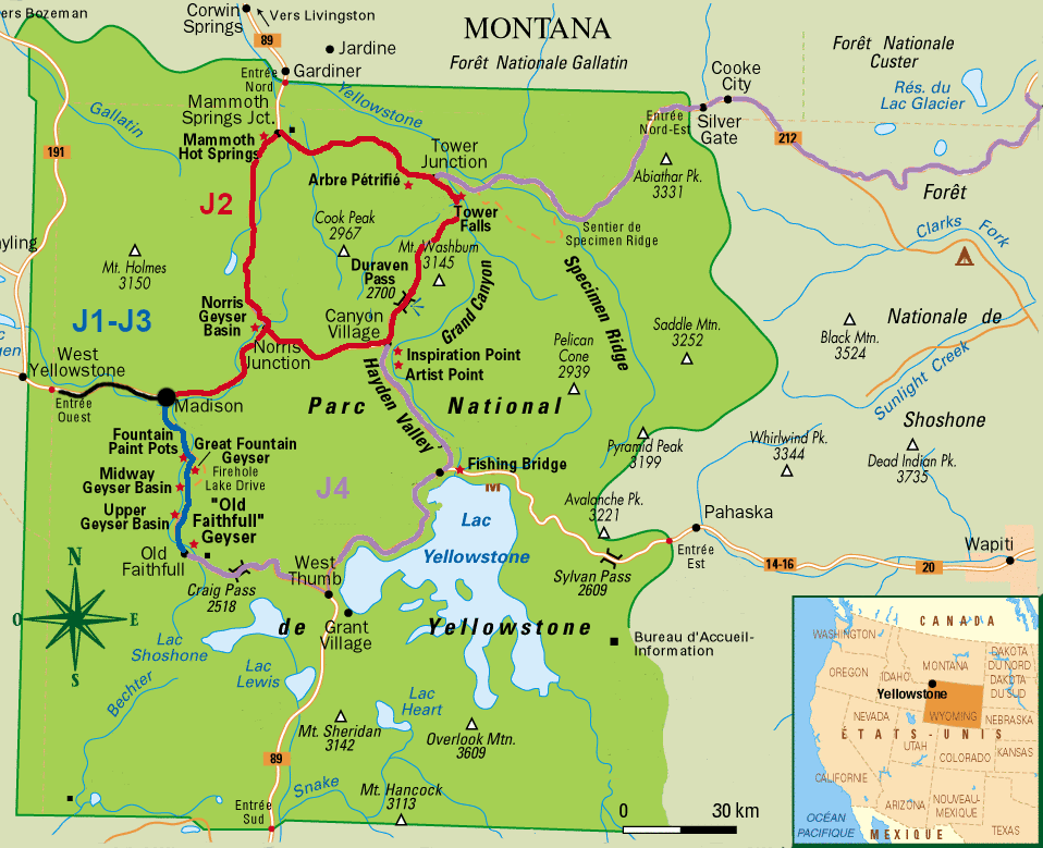 Quatrième et dernière journée à Yellowstone. La journée devrait être belle, mais la neige est toujours annoncée pour demain. Nous programmons de terminer la boucle sud et de remonter jusqu'à Tower Jonction pour quitter le parc par l'entrée Nord-Est. Nous prévoyons ensuite d'attendre la fin des intempéries à Cody, puis de revenir par l'entrée Est pour rejoindre le parc national de Grands Tétons.