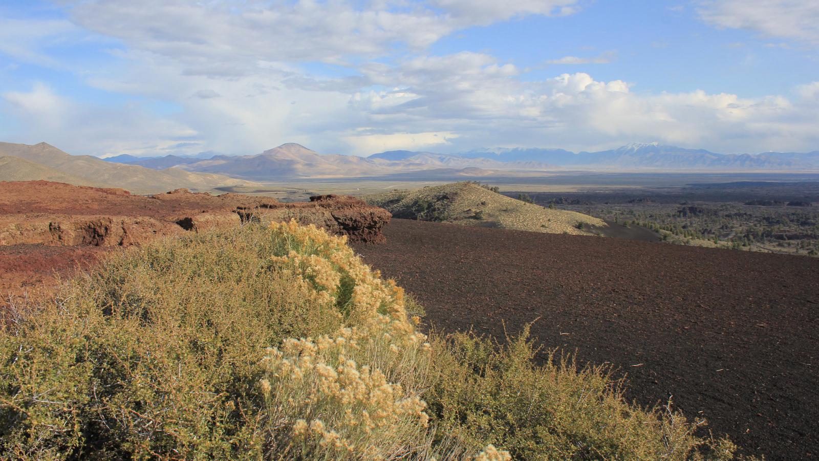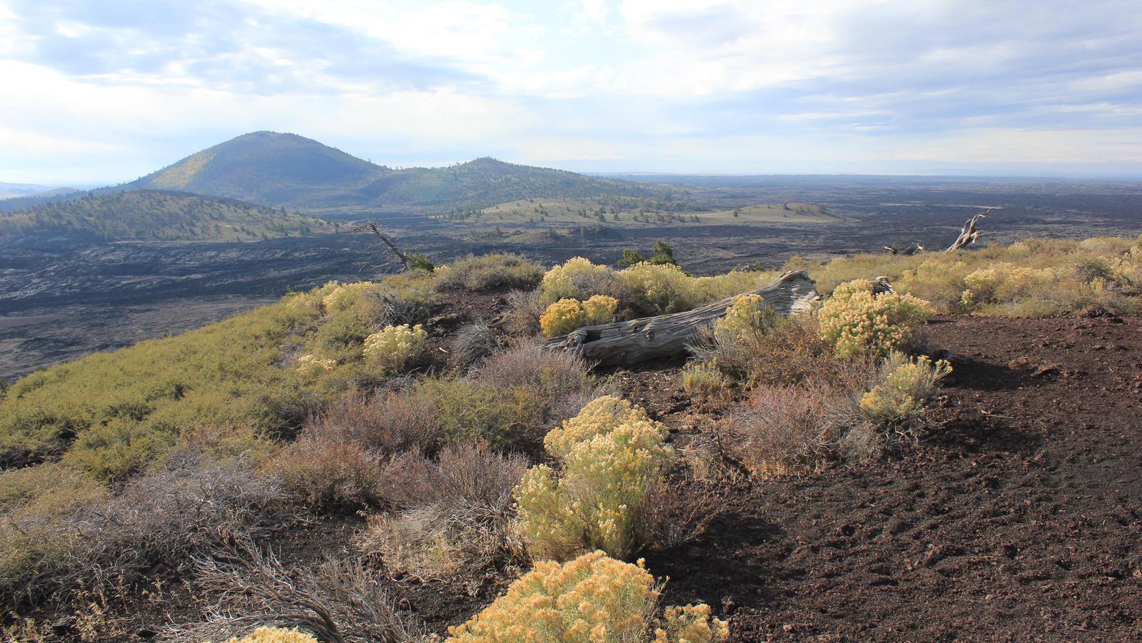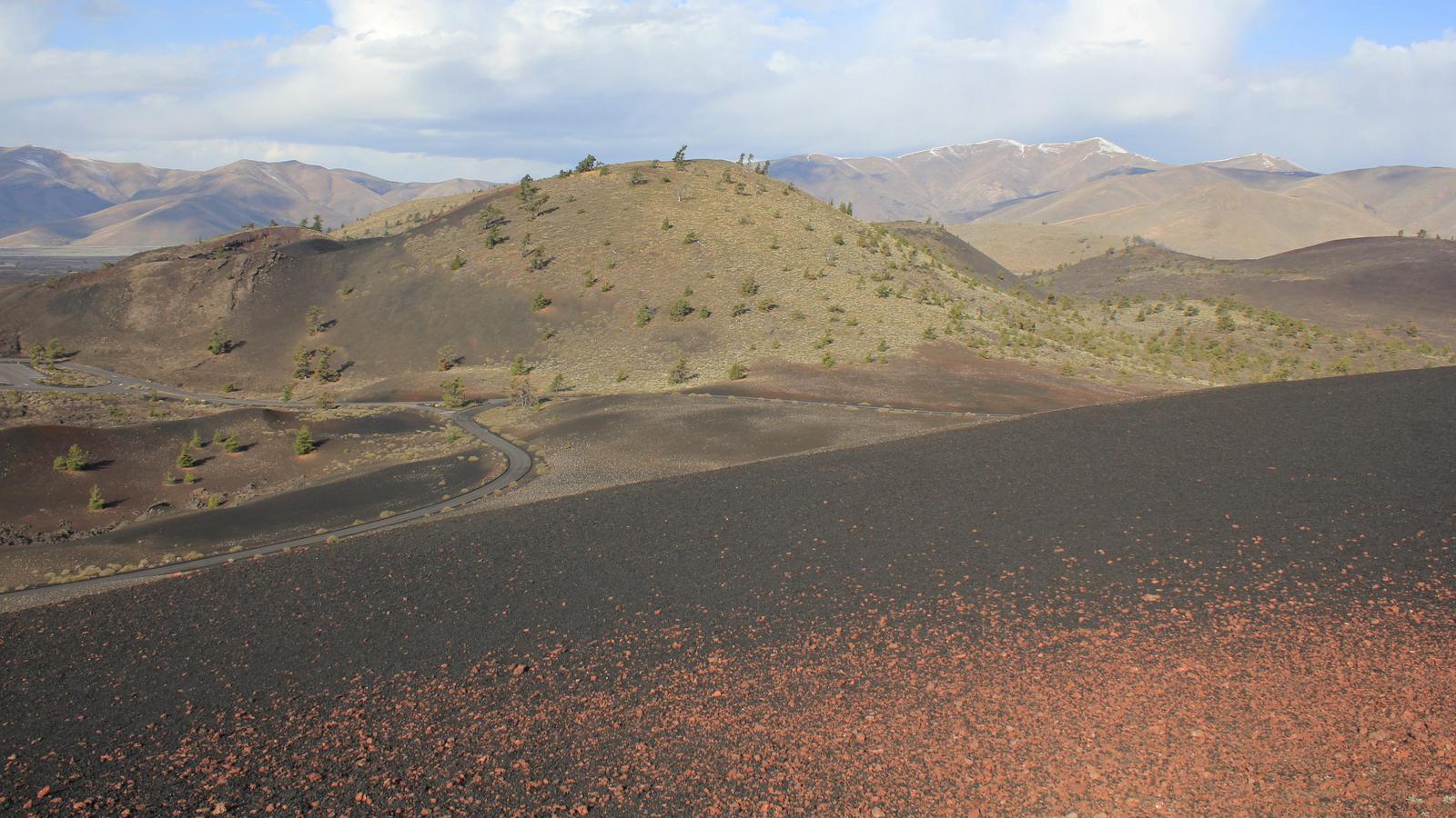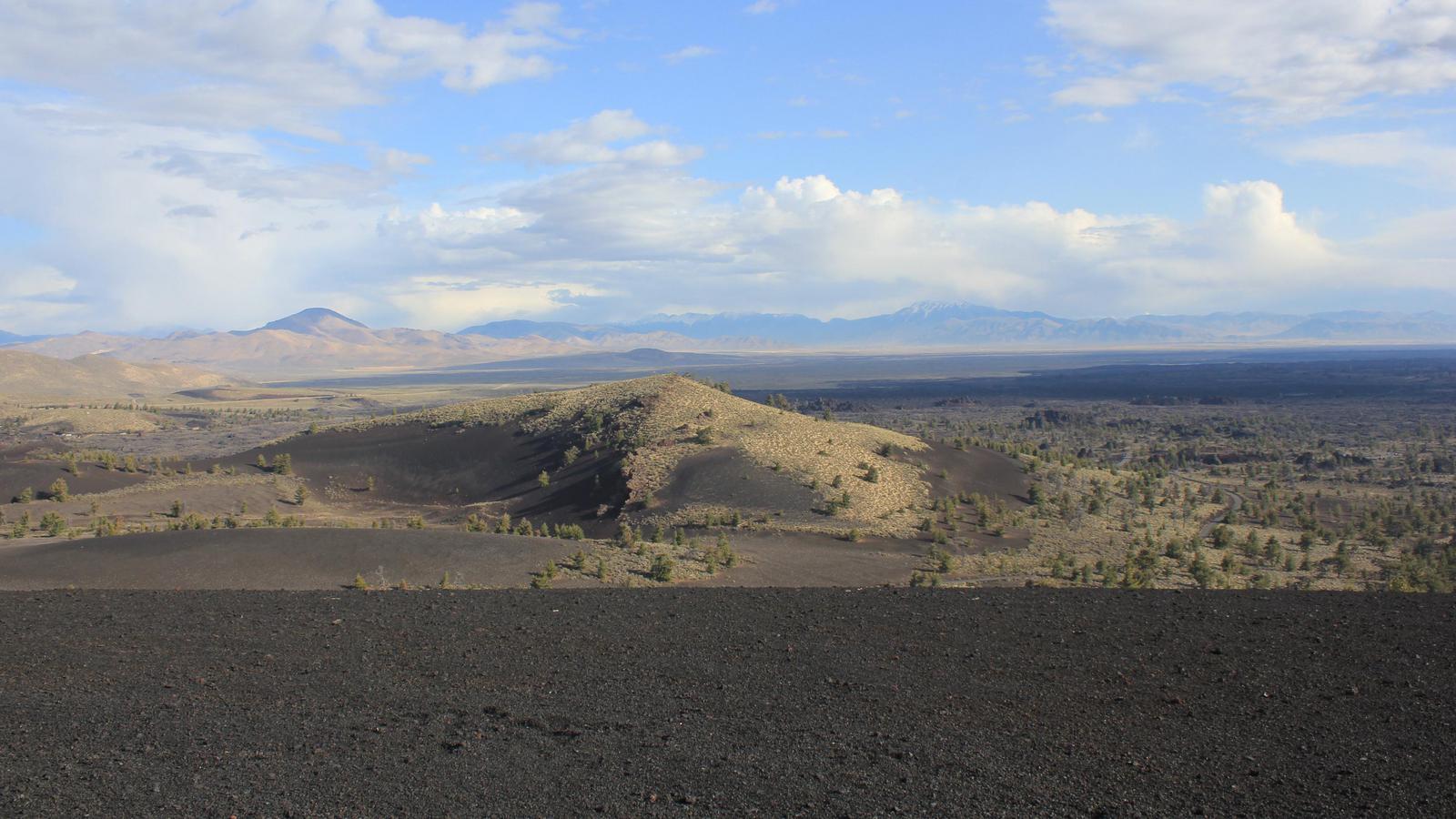 La lumière est assez jolie ce matin, nous nous empressons de retourner dans le parc. De la route circulaire partent des sentiers parcourant les champs de laves. Le plus interressant est celui de l'Inferno Cone, où après une montée bien raide, l'arrivée au sommet nous gratifie d'une vue à 360° sur toute l'étendue du parc, jusqu'aux sommets du massif des Grands Tétons.