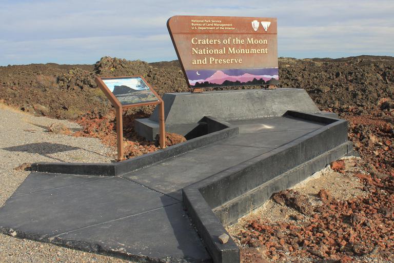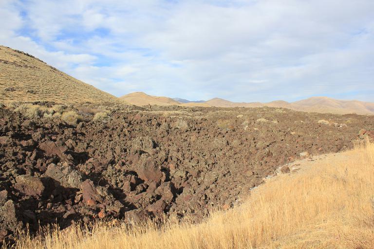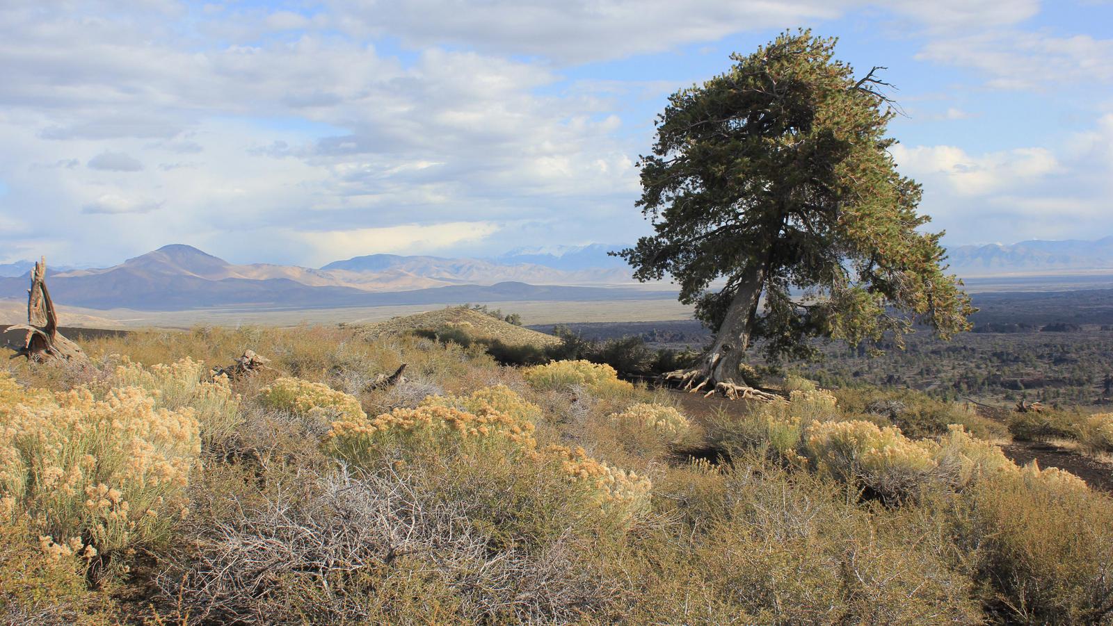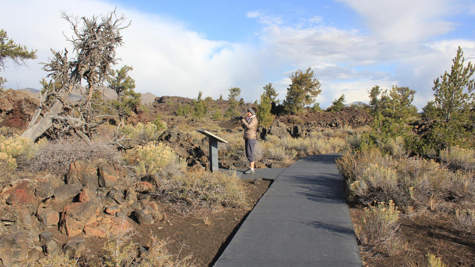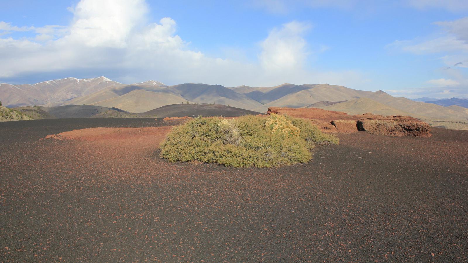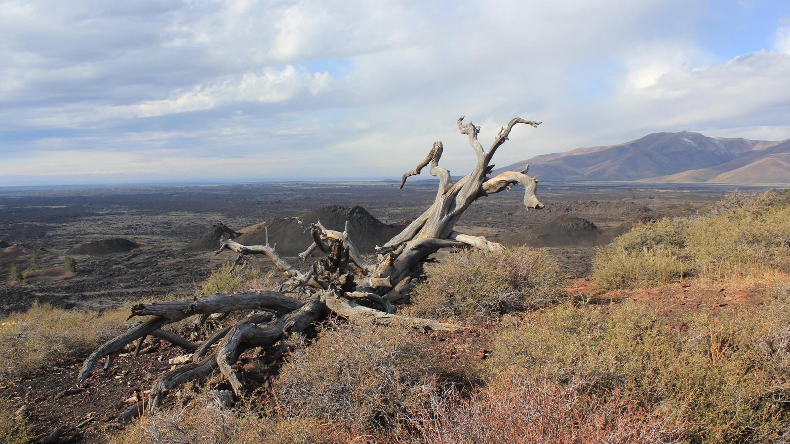 La lumière est assez jolie ce matin, nous nous empressons de retourner dans le parc. De la route circulaire partent des sentiers parcourant les champs de laves. Le plus interressant est celui de l'Inferno Cone, où après une montée bien raide, l'arrivée au sommet nous gratifie d'une vue à 360° sur toute l'étendue du parc, jusqu'aux sommets du massif des Grands Tétons.